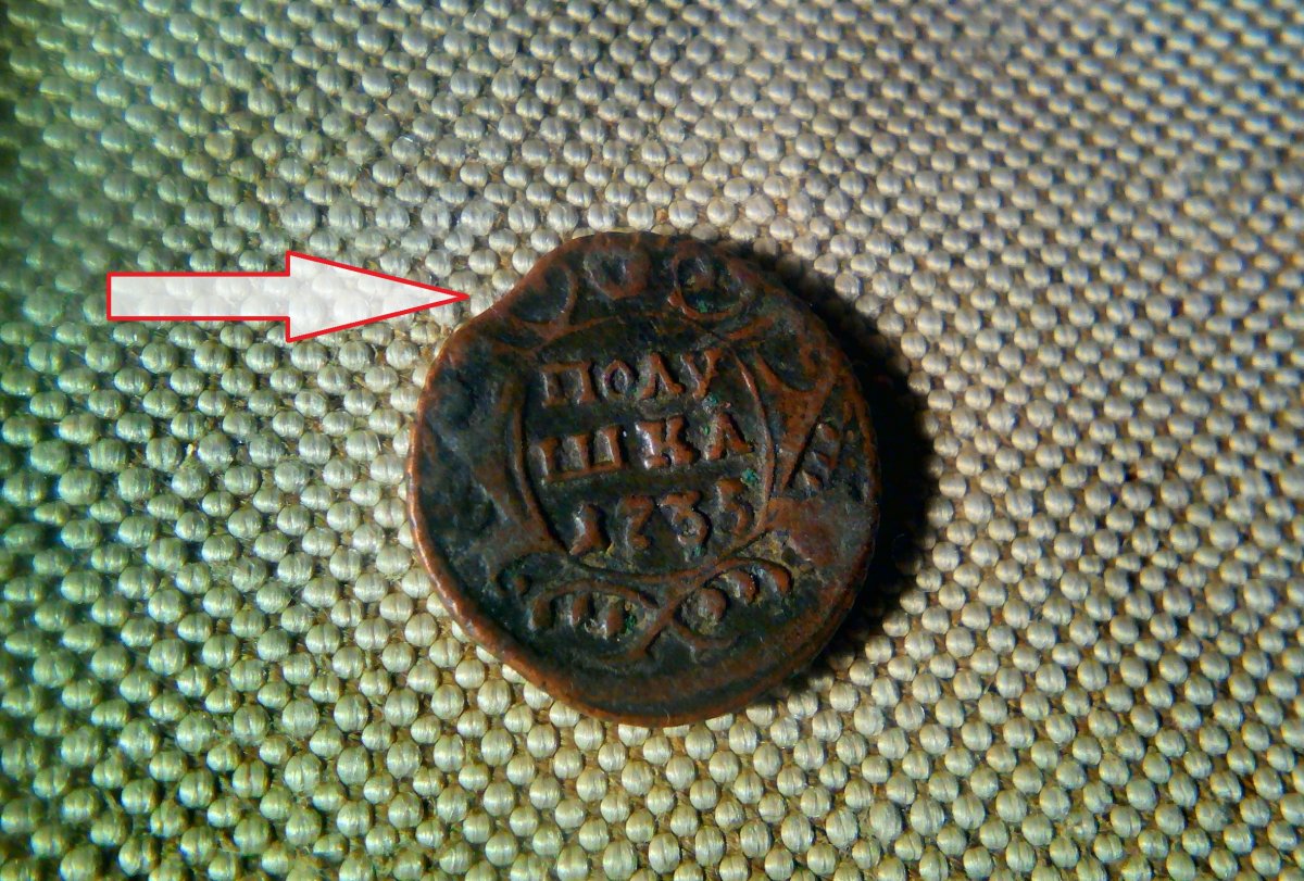 Точно, встречаются! И наверно даже чаще, чем следовало бы . Даже на единственной "полушке" 1735 г., которая у меня есть в коллекции (монета не с Лагеря), тоже не обошлось без такого "выкуса". Он, правда, небольшой, но всё же есть: Кроме "выкусов" были и другие дефекты. Вот такой "нецентровой" удар пуансона по медной монетной заготовке - и монета получилась слегка косовата : А про этот пятак даже не знаю, что и думать. Но похоже, это тоже какой-то заводской дефект (на обороте (гербе) никаких следов повреждений нет): Причем, с 1982 года по 1991 он был в ходу, пока я не увидел его среди магазинной "сдачи" и не выдернул в коллекцию в качестве нештатного сувенира из денежного оборота страны )). При этом, он неоднократно сдавался в госбанк, где бракованные монеты и банкноты подлежали немедленному изъятию. Продолжал оставаться в строю несколько лет - его не браковали, т.к. на нём хорошо видны номинал и год выпуска, а на обороте - вообще без повреждений. Возможно, к таким предметам, как пуговица, тем более, брючная (она не так заметна, как на кителе) всё-же было не такое жестко требовательное отношение. Всё-таки, это не деталь оружия, где недопустимы отклонения в +/- 0,05 мм. Наверное, во все времена в технической документации на изделие предусматривались допустимые отклонения, которые позволяли использовать определенную продукцию с незначительными дефектами.