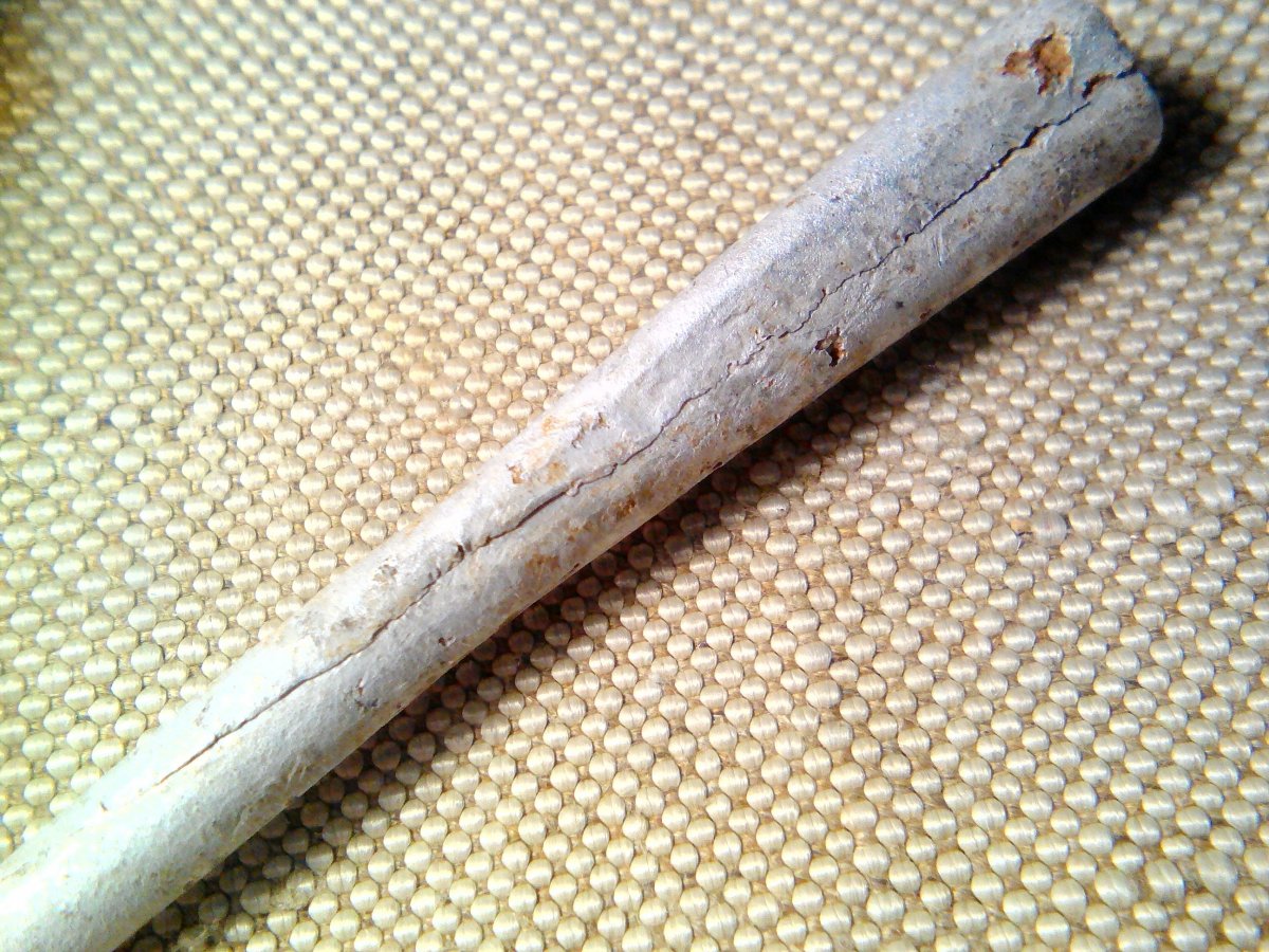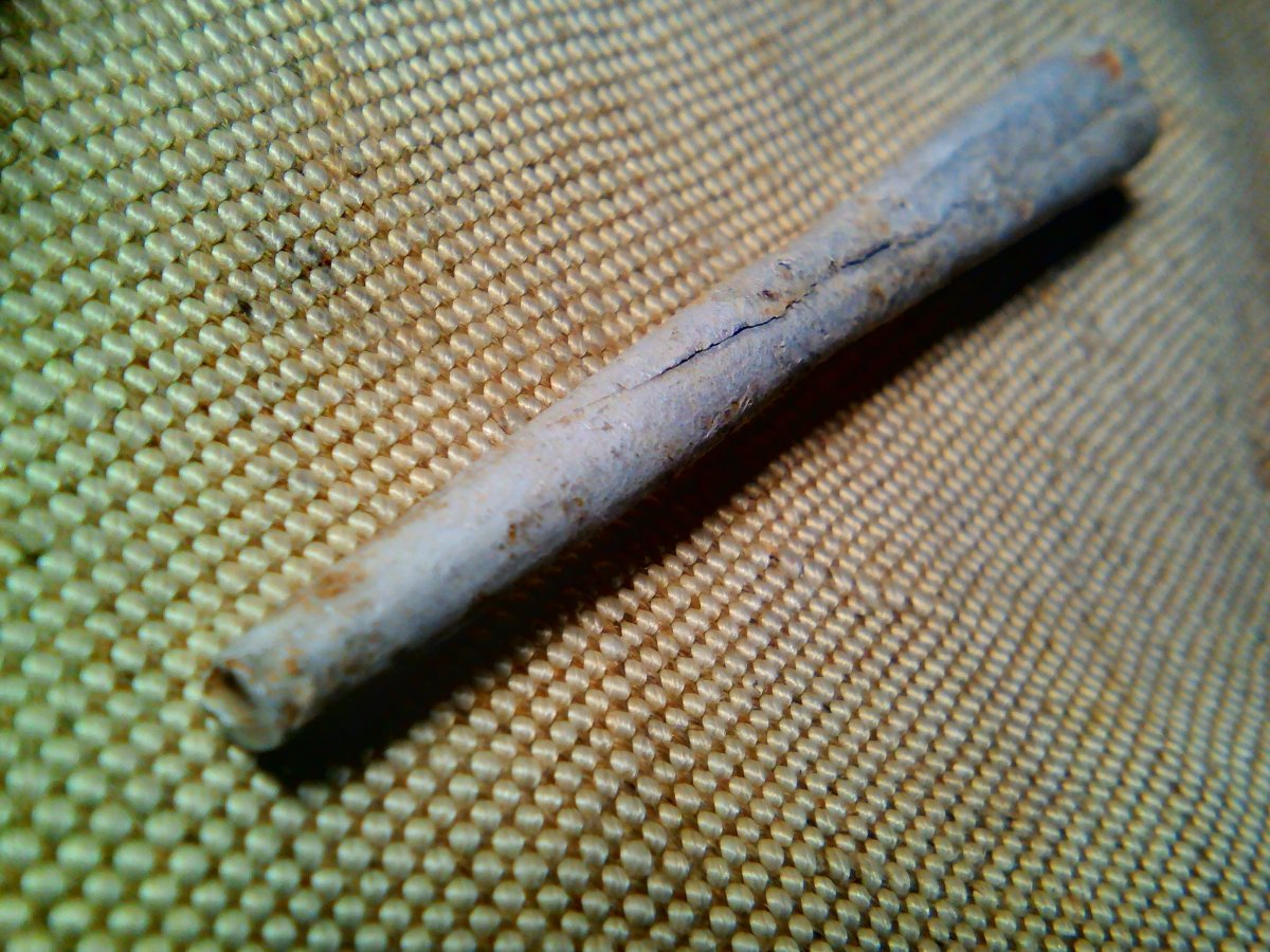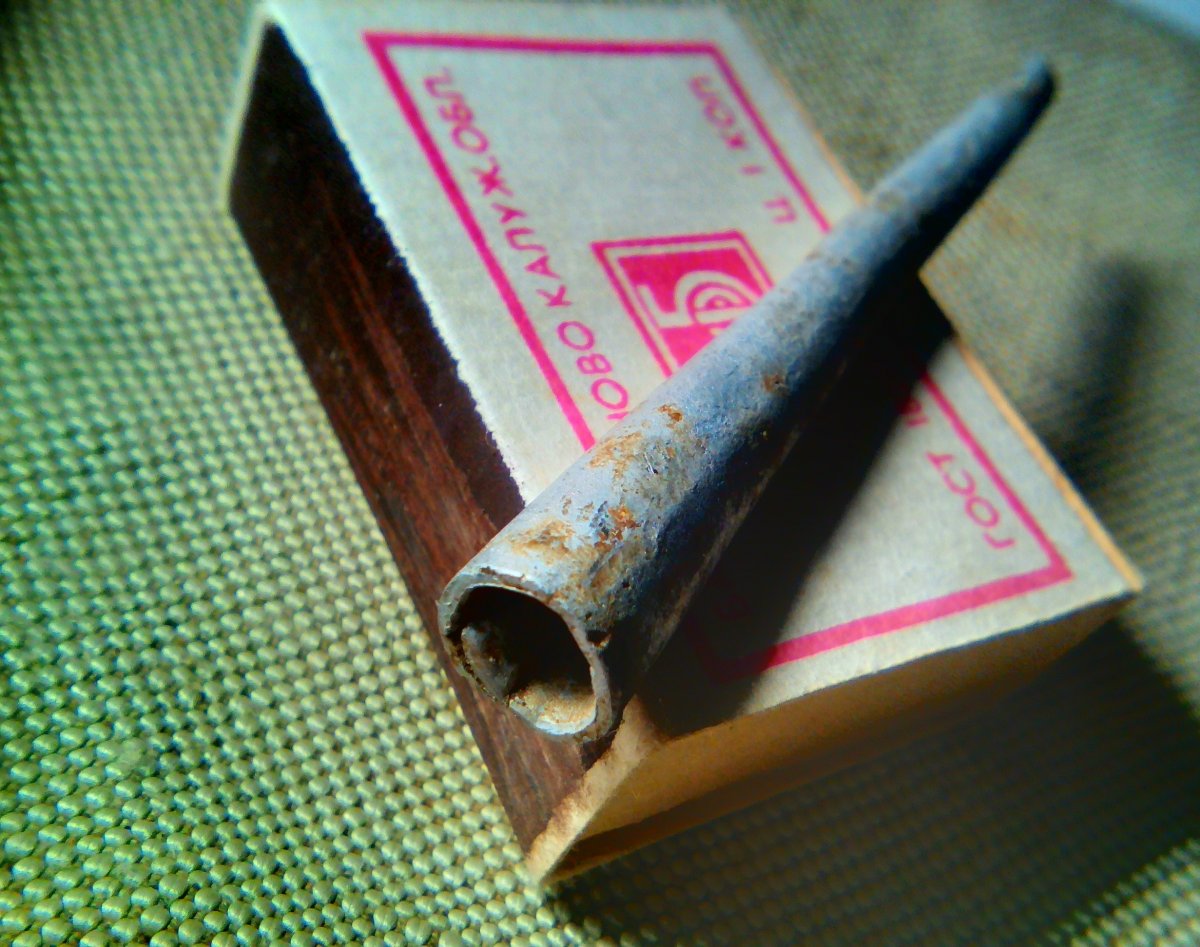 Чем-то похожим на такой наконечник была и эта конусная алюминиевая трубочка. Свёрнута по типу "козьей ножки". Но внимательно её рассмотрев, а также почувствовав едва уловимый запах никотина внутри ( и ведь сохранился же !!!!), я понял - что это самодельный мундштук! На фото 1 и 3 очень хорошо виден аккуратно склёпанный внахлест шов - тонкая работа, плотность соединения практически на уровне диффузии соединяемых поверхностей металла Не исключено, что сделан мундштук из мягкой алюминиевой стенки гильзы немецкой ракетницы - идеального и удобного поделочного материала у окопных умельцев. Жаль, нет на нём никаких надписей или инициалов. Но судя по специфическому коричневому налёту внутри - им когда-то активно пользовались!