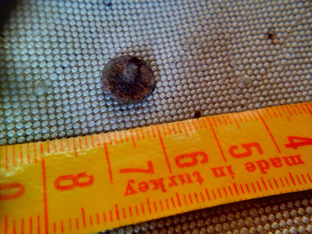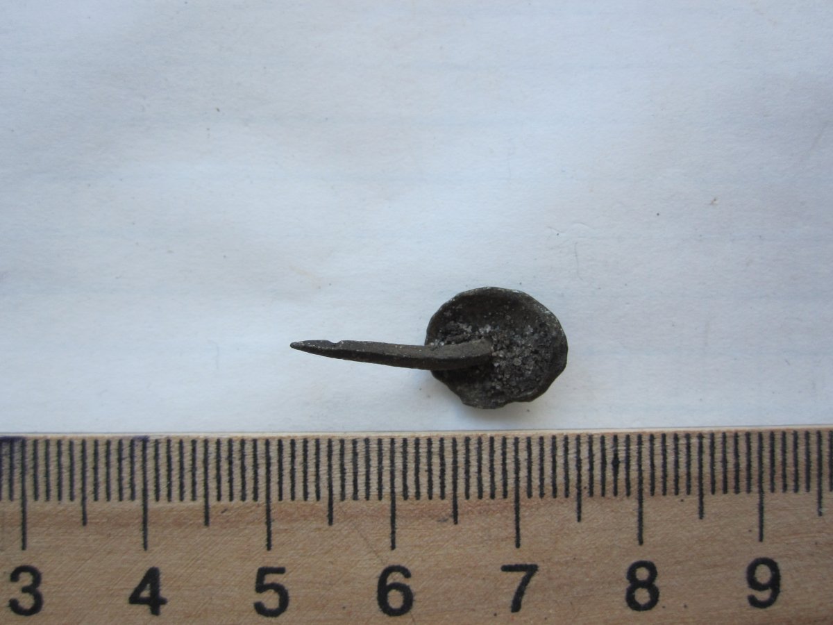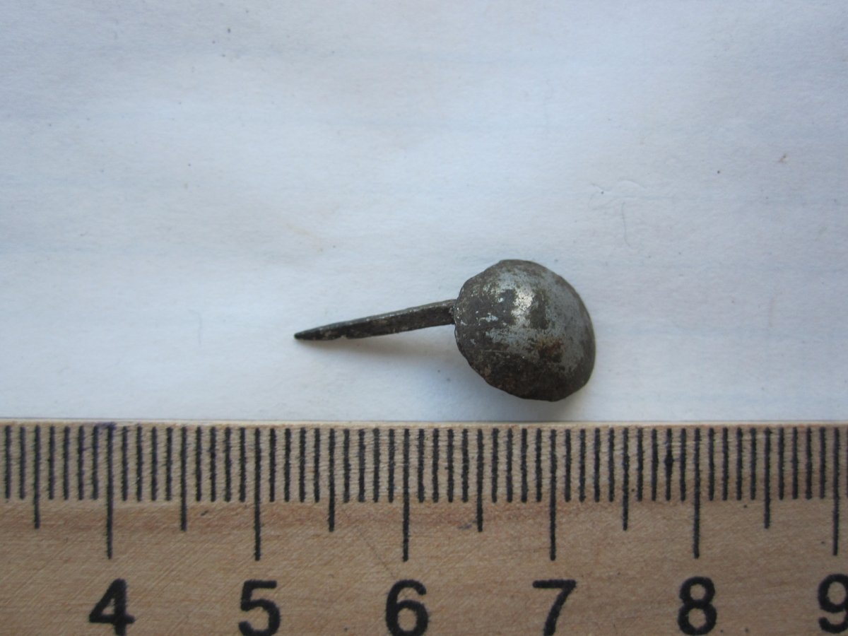 Возможно этот бронзовый гвоздик и с мебели или еще с чего нибудь(можем только догадываться ), однако : Такие бронзовые гвоздики использовались в конской упряжи , например в седле. Частая находка на хуторах 18 в - начала 20го. В том числе попадаются и на лагере . Бывают фигурные , с гладкой шляпкой , покрытые оловом и т.д. Представляю фото вчерашнего бронзового гвоздика с лагеря. Шляпка выпуклая , гладкая. Гвоздик вероятно покрыт оловом.