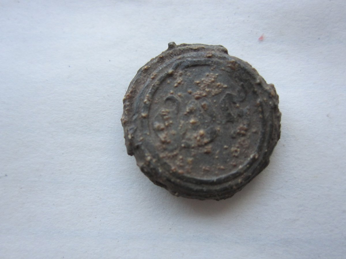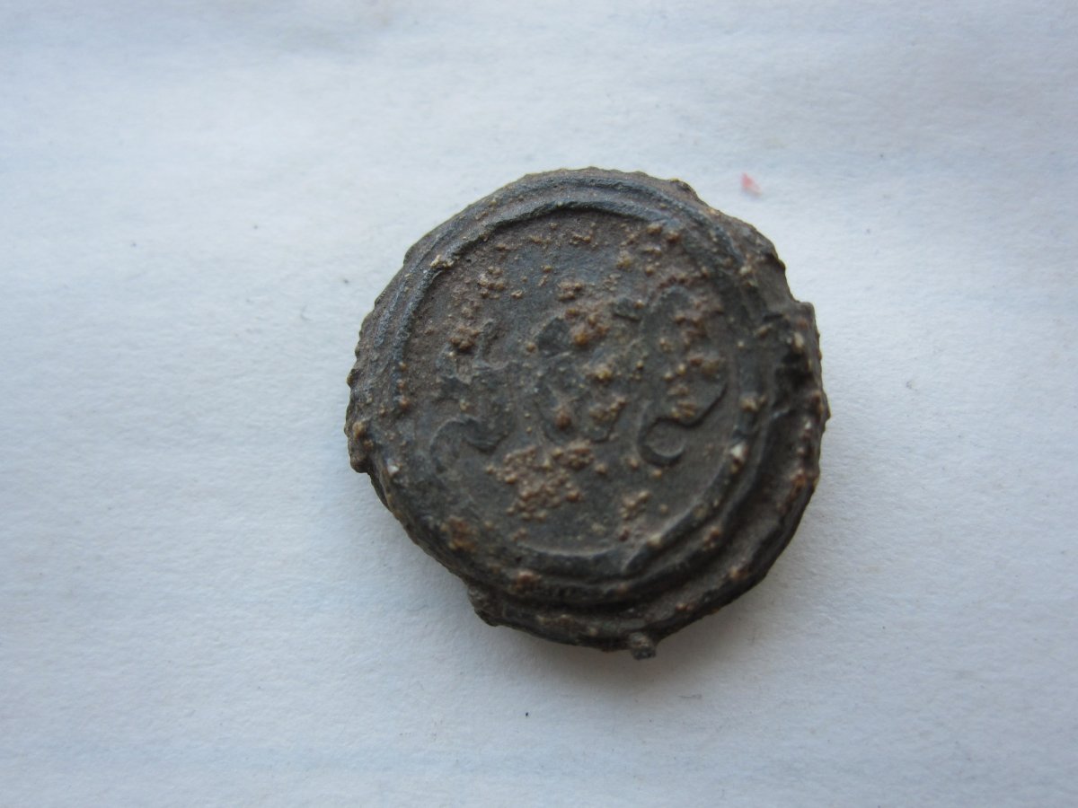 Вот попалась такая пломба. Одноглавый орел с опущенными крыльями. С другой стороны буквы какие то готические.