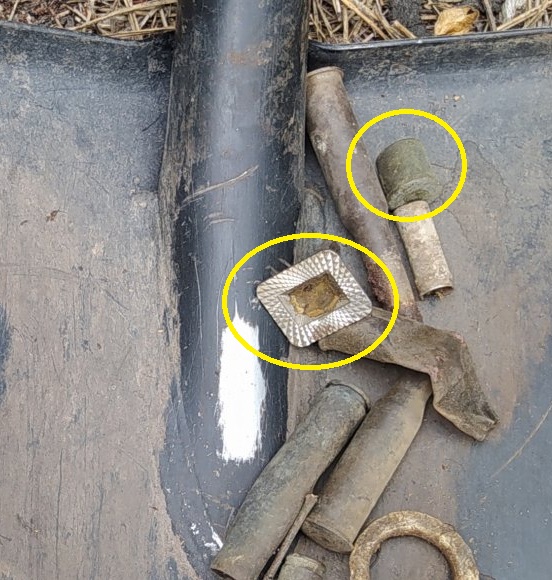 На первой лопате(камрада Skif67)Запонка и гильза учебного патрона,пломба В,непонятная латунная втулка.