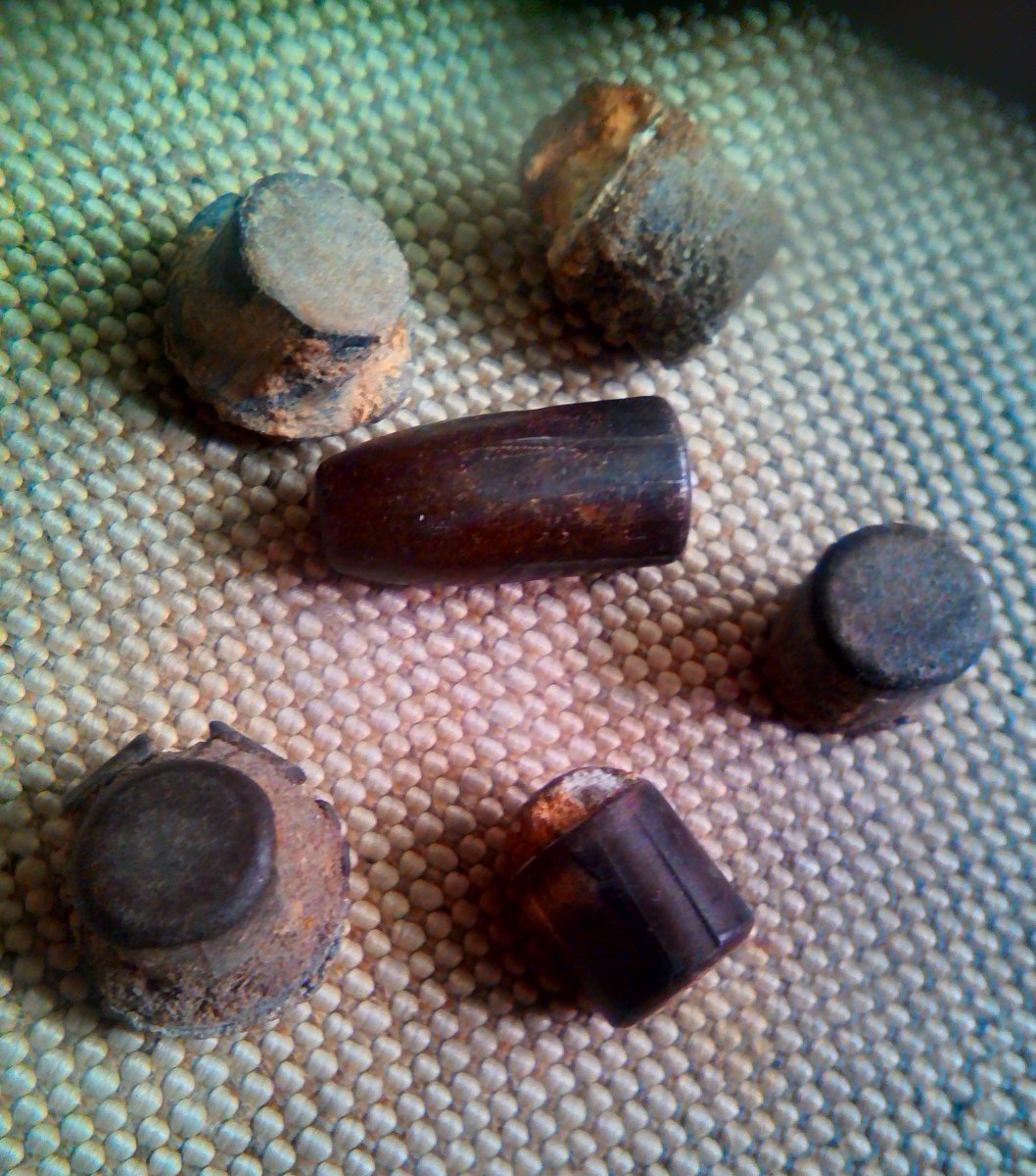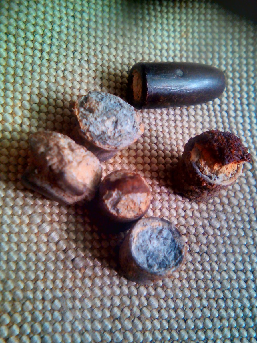 Вспоминая о стрельбищах НКВД , хочу добавить ещё одну разновидность находок. Давно уже попадаются в лагере фрагменты пуль, опознать которые пока не удавалось: Пуля Нагана рядом с ними - для размера. Калибр фрагментов - прим. 7,62. Рубашка мельхиоровая, начинка свинец. Донышко глухое, цельнотянутое из мельхиора. Изначально виделись экспансивные пули типа "ДД", запрещенные женевской конвенцией. Но в итоге оказалось всё проще - выставлял на опознание, помогли определить их как пули Бутурлина-Смирнского для практических патронов 7,62х54 "короткого боя" Ещё одно добавление к короткобойным практическим пулям Тарасова и их аналогам!