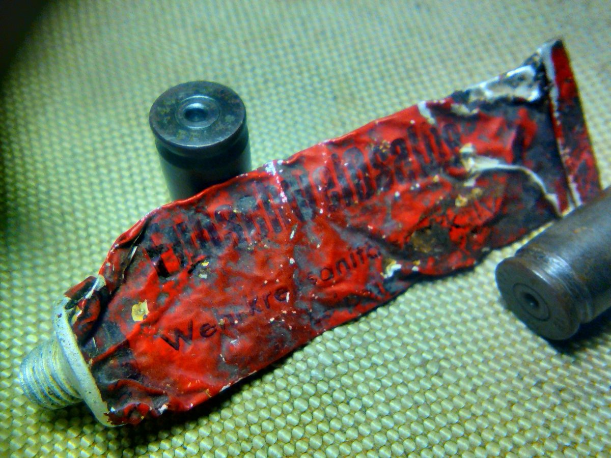 В продолжение разговора о находимых в тех краях тюбиках. Наследили немцы: 2% Салициловая мазь (с остаками содержимого): И мазь для борьбы с опрелостями на ногах ("Fußschweißsalbe"). Посмотреть, как эти тюбики выглядели в аптечке вермахта здесь: http://копанина.рф/publ/1/1-1-0-388 О как!! Какие только вопросы беспокоили народ на войне... А может, так оно и надо - война войной, а сохран здоровья - святая обязанность.