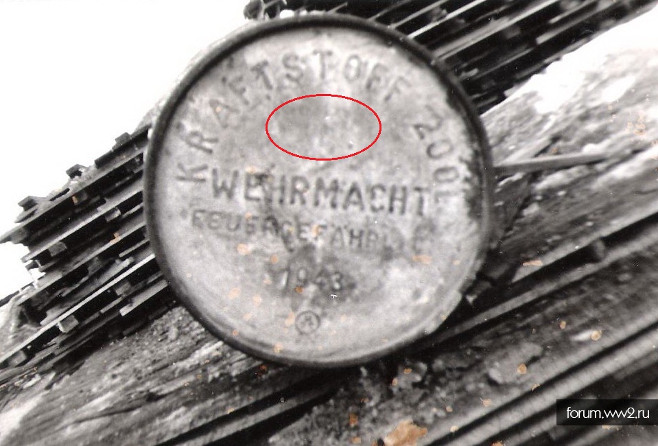 Да, очень похоже: Раз уж затронута эта тема.... Помню, какое-то время назад я уже здесь писал, что тогда же, в конце 70-х, я находил в лагере оцинкованную крышку верхней части такой бочки, которая "одевалась" на бочку внатяг за счёт кругового рантика. Дизайн крышки был примерно такой как на фото ниже, только вместо KRAFTSTOFF была выпуклая надпись SCHMIERSTOFF (смазочные материалы, вероятно это был солидол или что-то вроде того), и в том месте, где на фото отмечен красным овал, был выштампован выпуклый орел со свастикой, (по виду и форме, как на кителях вермахта) До сих пор жалею, что не забрал тогда ту крышку. По тем временам (всего-то 35 лет после войны), сохран оцинкованной крышки был просто суперский.... Даже не помню, чтобы там были следы ржавчины, только потемневший цинк. Однако, как бегут года... вспомнил про эту находку, а уже больше 40 лет прошло. Даже больше, чем на тот момент пролежала та крышка в лагерных песках с времён войны.