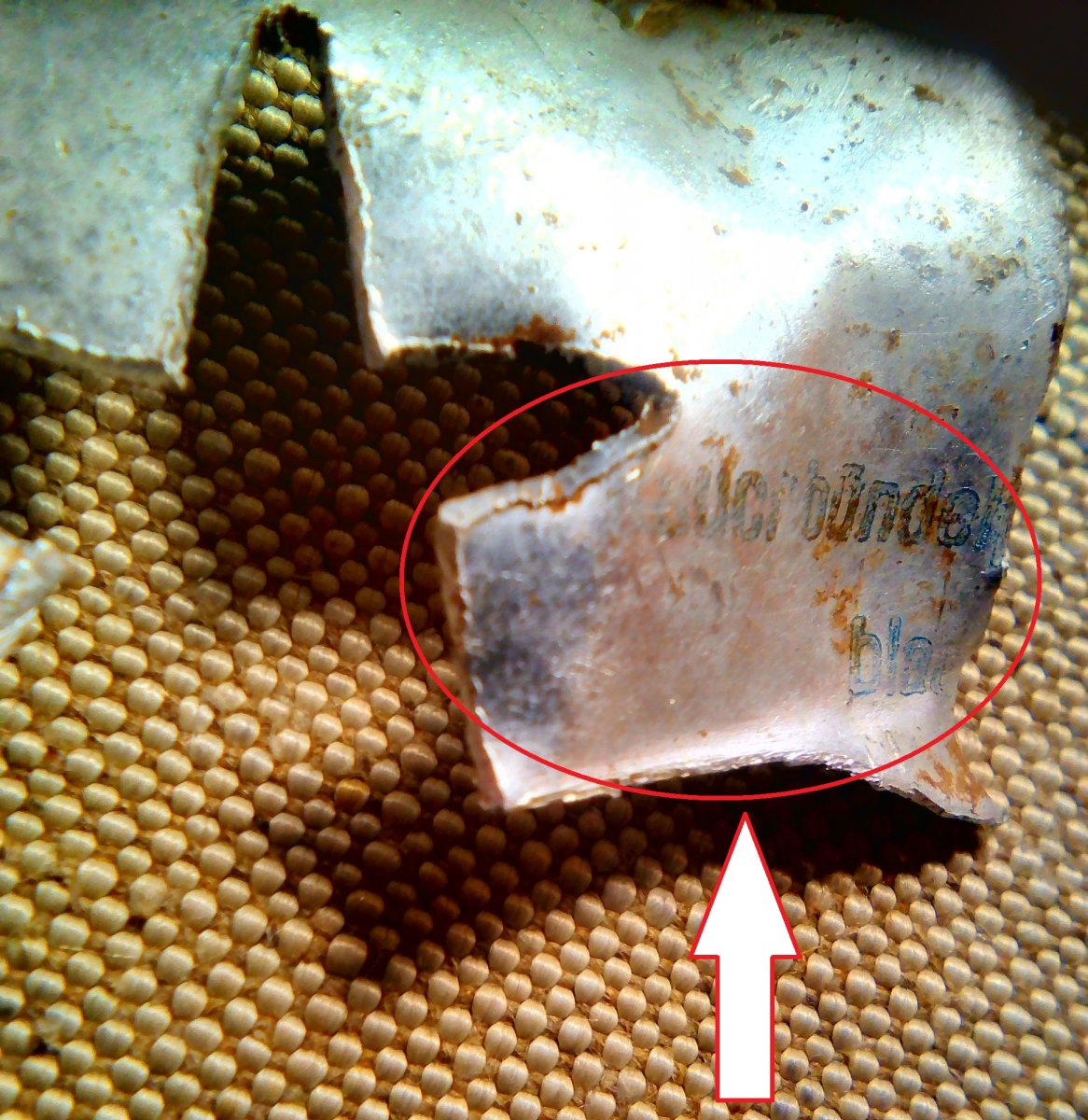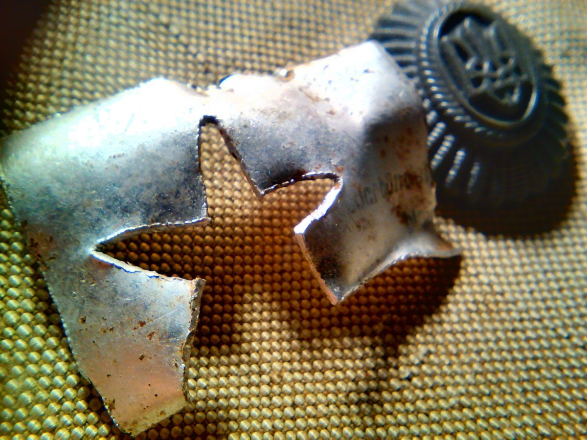 Могли резать на всякие поделки. Из алюминиевых гильз немецких ракетниц солдаты мастерили их огромное количество. Там после лета 1943 года стояли запасные полки РККА, формировались перед отправкой на фронт. Фурнитуры (в частности звездочек на шапки и пилотки) катастрофически не хватало, поэтому их вырезали из чего попало - алюминий, латунь из снарядных гильз, и пр. Вот как пример - звездочка была вырезана именно из гильзы немецкой ракетницы (это удалось установить благодаря сохранившейся "ракетницкой" надписи на поделке): Самодеятельность там попадалась самая невероятная - звёздочки, мундштуки, пряжки-"партизанки", точеные из пятаков бронзовые "треугольники" на петлицы РККА. И многое другое. Были умельцы, которые могли слепить и коронки, фиксы, и пр. Понятно, что коронки из золота или булата для солдат были недоступны, поэтому обходились металлом попроще. А лагерь для заключенных там действительно был. Только для немецких. В 1945-47 гг. там находился немецкий рабочий батальон из военнопленных, который принимал участие в строительстве автодорог (была здесь в теме информация об этом, причем информация из немецких архивов). Помнится только, что он был двузначным, и почему-то вертится в голове цифра "64". Но 100-процентой уверенности нет. Всё-таки, 40 лет минуло...