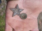 "Двушка" 1926 г. в левом верхнем углу - это моя самая первая находка в Лагере, лето 1977 г. Найдена поверху, на свежеперепаханой территории лагеря. Остальные щитовики и пятак - находки 1977-81 гг., также найдены поверху, визуально, после размывов песчаных борозд после дождей.