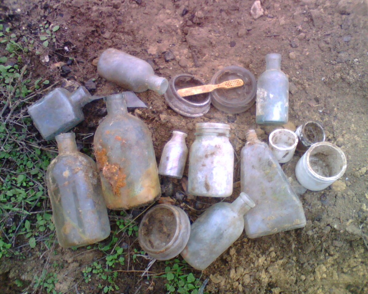 На Вашем фото есть несколько небольших пузырьков, похожих на те, что встречались на территории в/лагеря. Эта помойка, похоже, тоже не современная, судя по очертаниям предметов.
