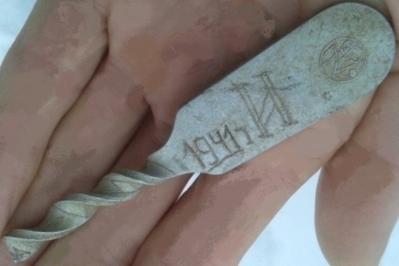 Возможно, что этот найденный на территории военлагеря обломок алюминиевой ложки принадлежал кому-то из новобранцев формирующегося там 777 стрелкового полка? На ложке выцарапана фамилия Бирюк (-ов?) (буквы фамилии проходят по согнутой в "штопор" ручке и на этом фото не видны). Обломок заканчивается на букве "к". Возможно полностью фамилия была "Бирюков". Видна также крупная буква "И" - первая буква имени. Иван? Игорь? Илларион? Игнат? (её видно на снимке):