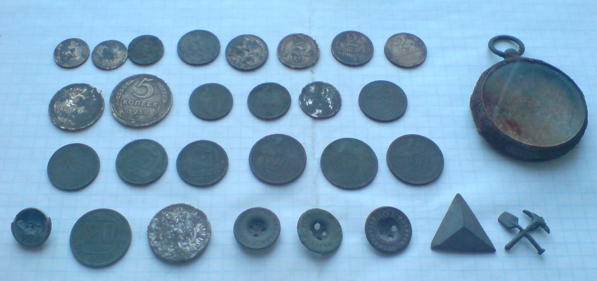 Вот фото моих находок с лагеря, среди монет выскочила довольно забавная петлица и это подсказка какое из подразделений там находилось.