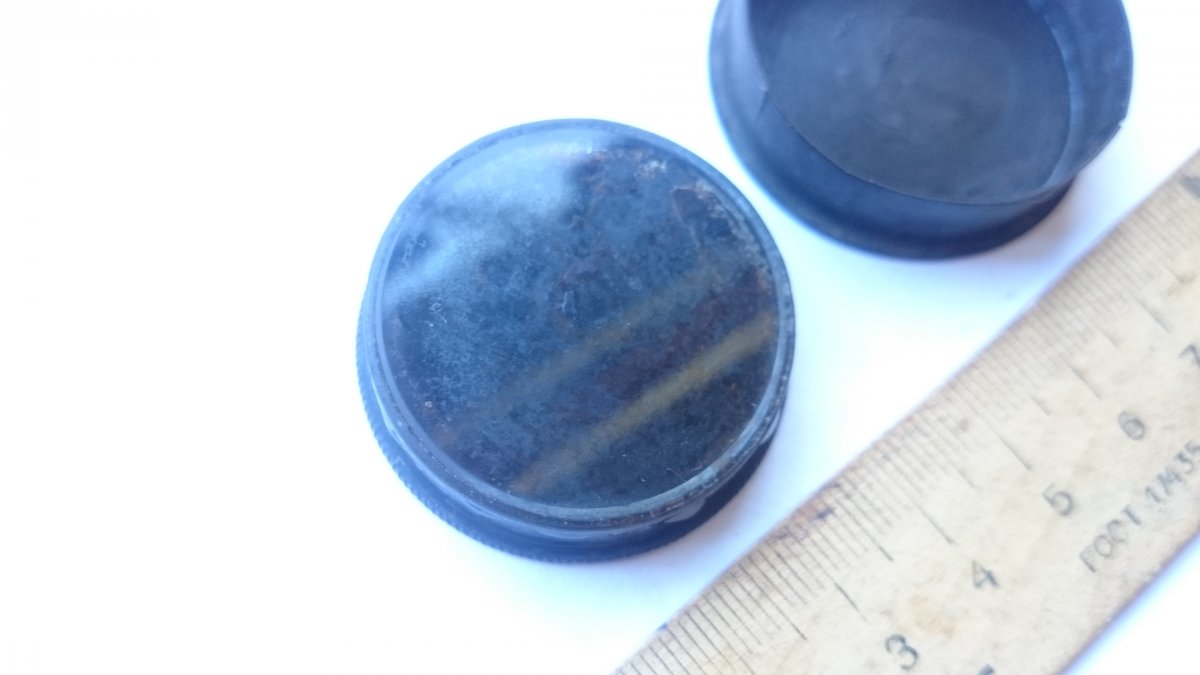 Может быть это металлическая баночка из-под какой-то мази? В советские ( в уже более поздние) времена по аналогичной технологии закрывались металлические баночки с вазелином (крышка просто одевалась на баночку, и чтобы её потом открыть приходилось усердно поддевать крышку ногтем ) Как раз и размер тех бвночек с вазелином былпримерно таким же, около 3-4 см. в диам. На вашей находке видна накатка для удобства вращения и открывания - чуствуется, что в БОЛЕЕ давние времена было больше заботы об удобстве потребителей. Тут уже возникает подозрение - а не осталась ли эта баночка от германского нашествия? У немцев было много таких кундштюков - всякие баночки с мазями, бальзамами и пр. Но обычно на немецких изделиях присутствует штамп хотя бы пары букв и цифр. А на вашей похоже, никаких обозначений нет. Но всё равно, от этой находки так и веет "импортом". Наши бы не заморачивались со всеми этими накатками на крышках, а отштамповали бы просто, без всяких фокусов.