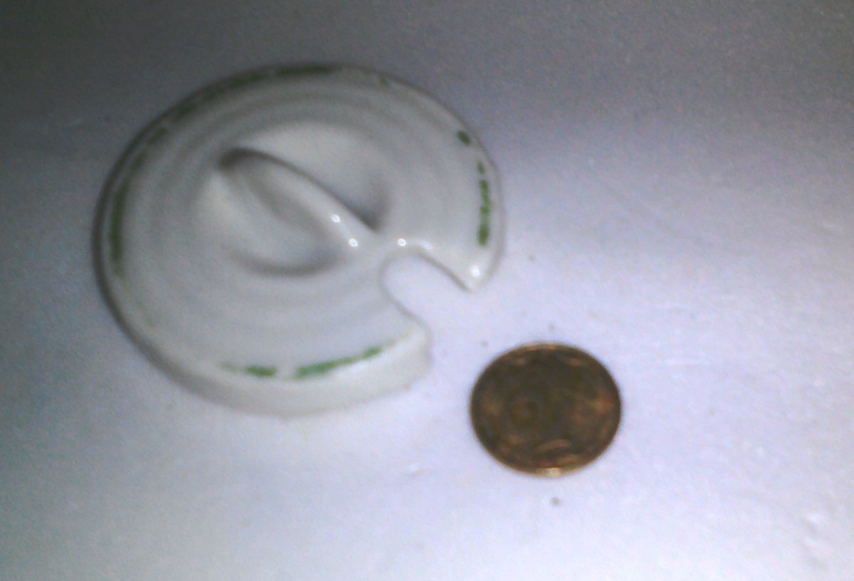 Ещё немного о посудных находках. Вот такая крышка от горчичницы (рядом монета 10 коп. для размерности). Крышку нашёл Skif-67 А на втором фото - осколок чашки с рисунком. От неё же мне попадался ещё один кусочек, на котором был виден другой фрагмент этого рисунка (этот второй фрагмент я утерял, не придав ему значения). Можно предположить, что на рисунке был изображен кто-то в длинной рубахе (или гимнастерке, подпоясанной шнуром или верёвкой, как было принято по неписанной крестьянской моде тех времен). Возможно, это был какой-нибудь сервиз, посвященный РККА, или что-то в этом роде.