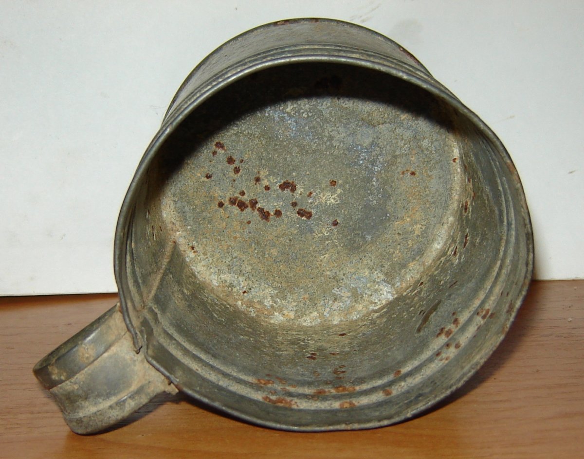 Добрый вечер! Так это практически такая же, как и моя! Литраж 0,5 Л ? У Вашей сохранность намного лучше, можно сказать, практически складская, с учетом её возраста. Скорее всего - оцинкованная жесть, хотя - судя по сохранности, Ваша может быть и луженной . Ваша - тоже находка с военлагеря? Есть какой-то штамп на днище? У моей практически всё дно снаружи ржавое, ничего не видно по маркировке. P.S. Сейчас ещё раз пересмотрел свою, и окончательно убедился, что наши кружки - близнецы-братья, только сохран отличается.