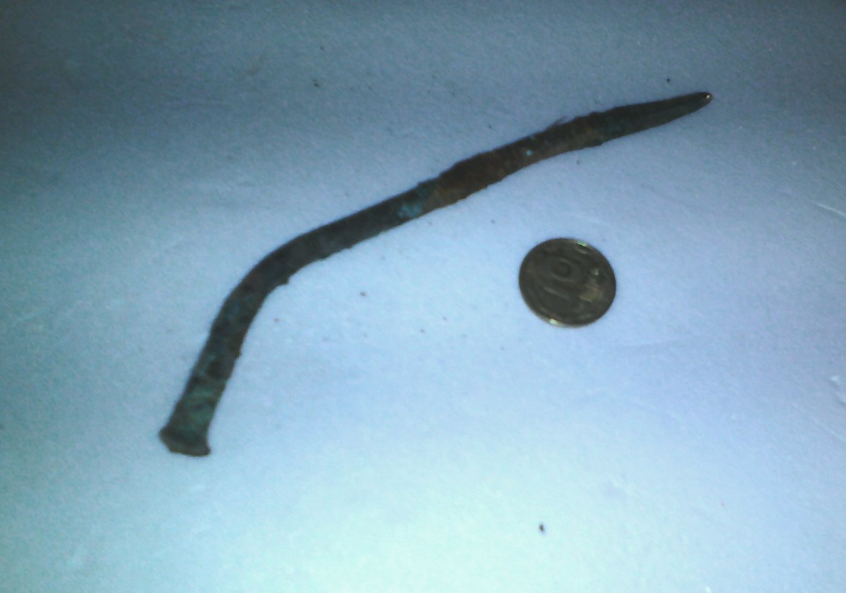 Добрый вечер! Пробки к флягам - вполне возможно. Осколки и крупные фрагменты таких стеклянных фляг там попадаются иногда, всё ещё надеюсь найти не битую. Да и к медицинской посуде они тоже могут быть. Находил там когда-то очень маленькие резиновые конические пробки, буквально такие, что можно затыкать в ствол 7,62 мм. Позже находил в интернете описание старой технологии восстановительного воронения оружия - там как раз такие пробки нужны для предохранения канала ствола при погружении его в хим.раствор. Может в военлагере была также мастерская по ремонту стрелкового оружия и восстановления воронения? В принципе - могла быть. А вот медный гвоздь такой длины заинтриговал - в и-нете есть информация про медные гвозди, но в основном о коротких, для декоративных и мебельных целей. Этот, что мне попался - слишком длинноват для этого. Да и забить его в древесину при такой длине достаточно сложно - всё-таки не стальной. Может для каких-то особых конструкций, которые находятся во вредных условиях, где стальной быстро ржавеет? Раз пошёл разговор о крепежных деталях, вот костыль от той самой узкоколейки, что шла к военлагерю. (Хотя может быть он и от довоенной трамвайной колеи, что вела от ж/д станции до озера Банное). Длина костыля - 120 мм. По ГОСТу - это самый короткий и мелкий из ж/д костылей: