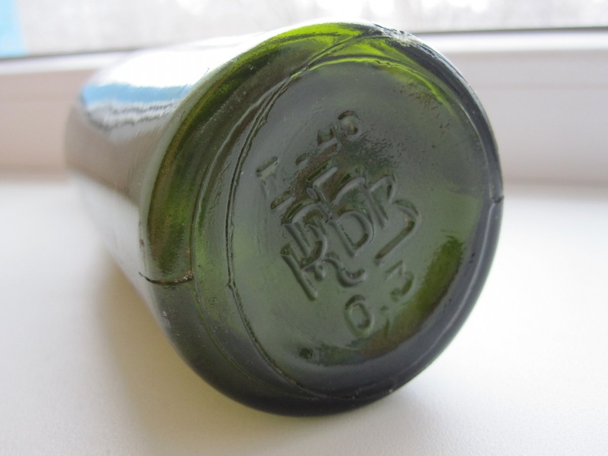 На фото показалось, что стекло у 0,3Л бутылки светло-зелёное. Темнозеленое, почти черное стекло встречалось практически у всех найденных пивно-минеральных бутылок того времени. Только один раз попалась бутылка 0,5Л 1940 г. с более светлым зеленым стеклом. Коричневое стекло у таких бутылок по довоенным годам изготовления не встречалось никогда. Ну, насчет содержимого 0,3 л бутылки, в любом случае - это было что-то пищевое. Кстати, мог быть и уксус для столовых военлагеря. Для пива и минералки, 0,3 Л всё же маловато - не нашенский это формат. Вы обратили внимание, насколько толстостенными и тяжелыми были пивные бутылки 30-х годов?