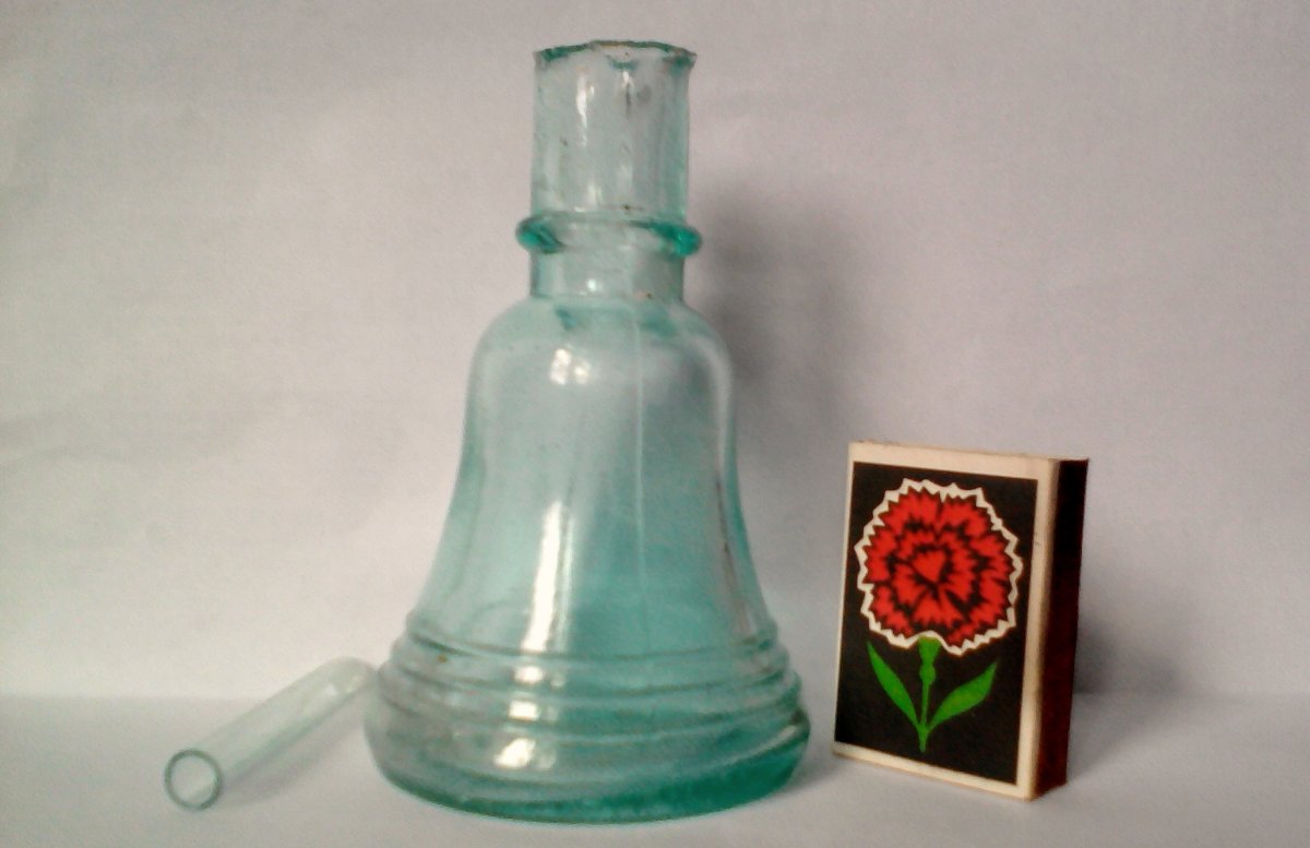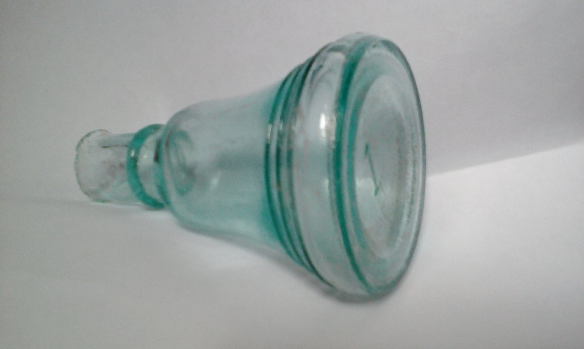 Ещё из стеклянных находок военлагеря. Вот такой пузырёк - "колокольчик". Был найден с остатками белого мелкодисперсного осадка внутри на донышке. Эта белая смесь похожа на сульфит бария, который применяется в рентгенографии для контрастных снимков внутренних органов. А может это был кокаин ? Маленькая пробирка (на фото 1) тоже была найдена рядом с пузырьком. Маркировки на дне пузырька нет - только выпуклая цифра "1" :
