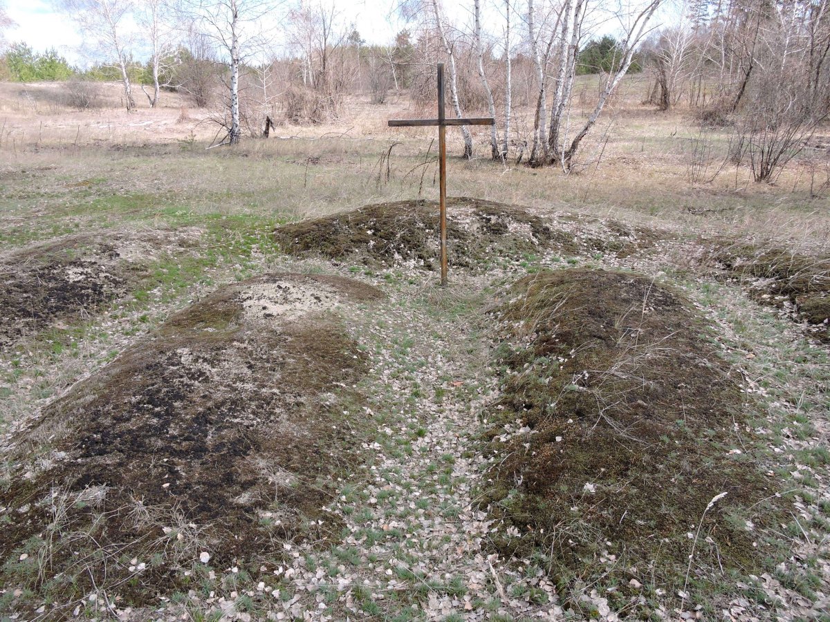 там 3 холмика как на кладбищах только больших и крест большой деревянный. скорее всего это уже после развала делалось. иначеб эти холмики уже небыло и видно