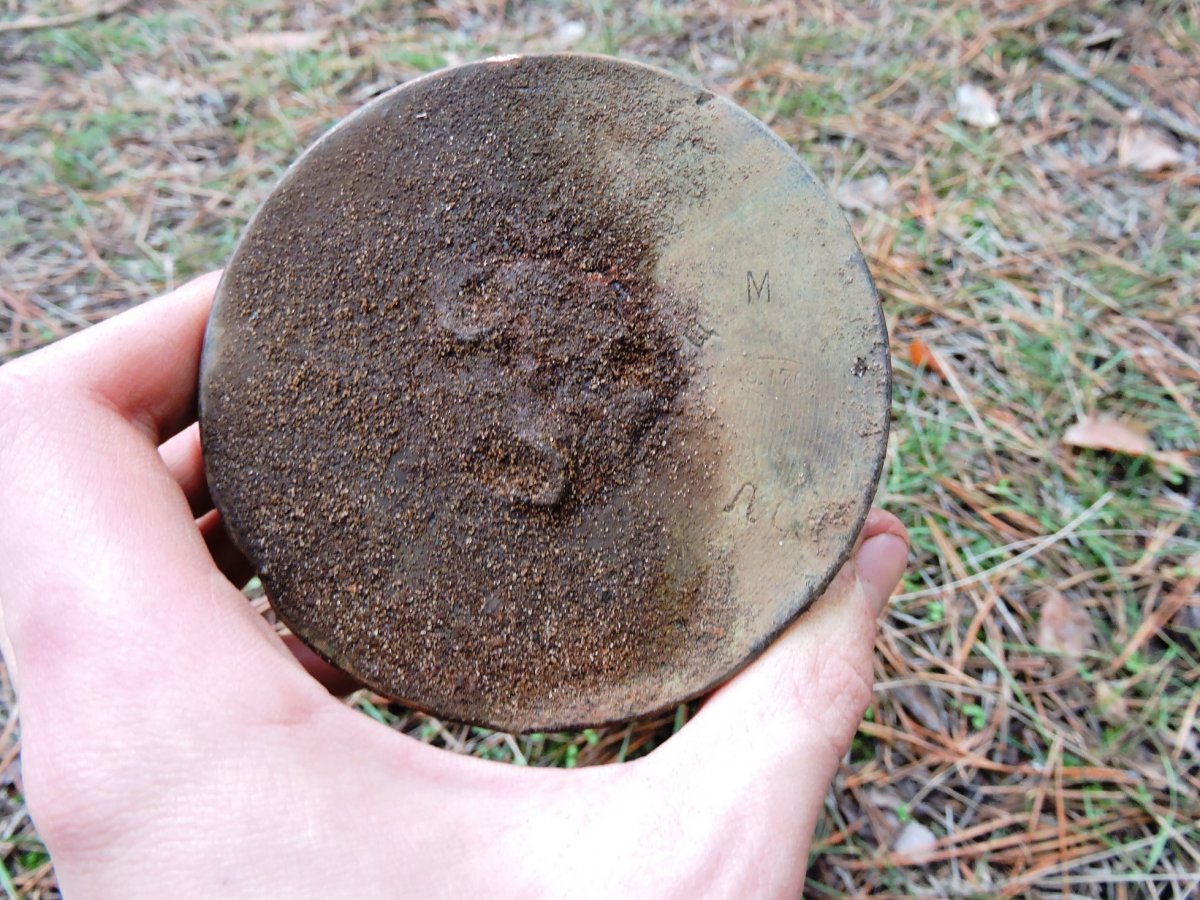 Вот ещё одна находка, уже под конец сезона. Попался вот такой крестик, медный. Он с дефектом - нижняя часть отломана. Я вначале очень огорчился, думая что это я его так зацепил. Оказалось, что нет, он таким и был утерян - место отлома окисленное как все остальное, прочным зелёным налетом. Тогда немного полегчало - все таки не я его сломал, дефект пришёл из глубин Истории. Надо сказать, не смотря на то, что крест кустарной работы, но сделан достаточно тонко. На перекладинах креста по бокам видны тонкие штифтики - возможно к ним дополнительно крепилось распятие. Ширина крестика по краям горизонтальной перекладины - 4 см. Скорее всего - он времен начала ХХ века, не позднее начала 30-х годов.
