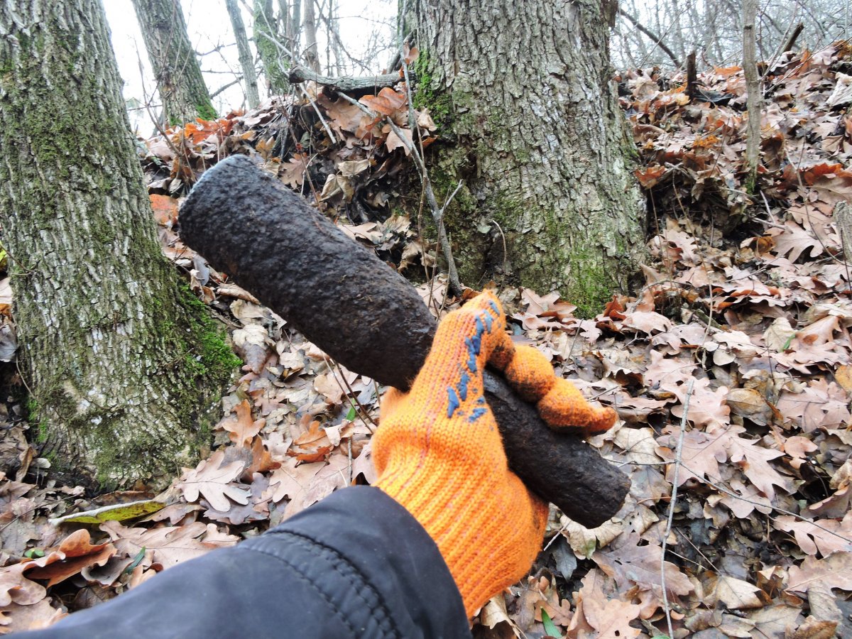 Добрый вечер! Всегда было интересно обращать внимание на всякие подобные деталюхи. Иногда они дают представление о том, какой был уровень технического оснащения войск того времени, какие металлы и материалы использовались при изготовлении предметов военной амуниции и армейского быта. К сожалению, не всегда удаётся понять и определить назначение находок, имевших отношение к технике, поэтому есть надежда, что будет какой-то ответ в процессе обсуждения. По поводу того места, где эта непонятная деталюха была найдна. Я на неё наткнулся ещё прошлой весной, шел примерно на юг от п.Бондаренко, левее от дороги, которая южнее памятника выходит к перекрёстку грунтовых дорог (возле этого перекрёстка стоит столбик, место довольно известное ) Не доходя перекрёстка, левее дороги были ямки, там же неподалёку и лежала эта "непонятина" с алюминиевой накладкой. Похоже, что её где-то там откопали и бросили. Кстати, примерно там же на сучке дерева кто-то подвесил половинку немецкой катушки от телефонного кабеля (см. фото внизу). Чего-то кажется, что эти находки с одного места. А по размерам могу сказать только примерно. Я её после того как нашёл, сфотографировал, и откинул под кусты неподалёку, чтобы не "отсвечивала". Позднее, уже осенью, захотел её ещё раз хорошенько рассмотреть - но увы, под кустом её уже не было, не исключаю, что могли забрать "металлисты". Поэтому размеры привожу по памяти, приблизительные. Ну и заодно фото того обломка немецкой катушки :