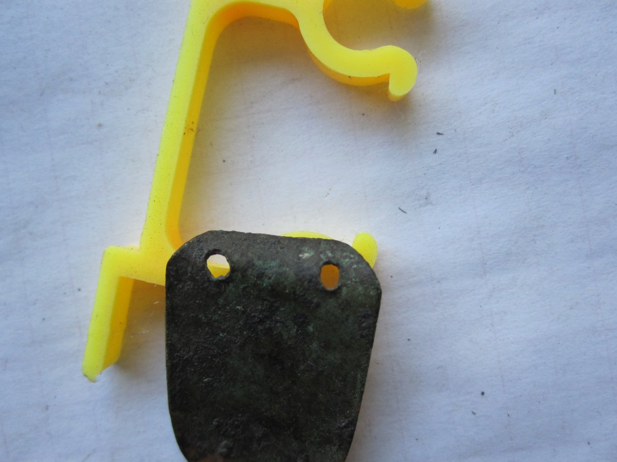 Если бы эта находка была не из глубины, то я подумал бы, что её потеряли в 80-е или 90-е годы "металлисты". Помните, были такие любители стиля "HEAVY Metall Rock", :) :smile_9: носили браслеты, ошейники и одежду с металлическими шипами? Второе (после наконечника стрелы:)) предположение было, что это не иначе как шип с "металистского" браслета :D. Но лежала она глубоковато и сопутка рядом встречалась как минимум с военного времени, а кое-что и даже более раннее. Поэтому, вариант с деталью от браслета "металлистов" тоже отпал. Тем более, что слой патины был очень толстый, явно видно, что этот "шип" намного старше эпохи "рок-металлистов"
