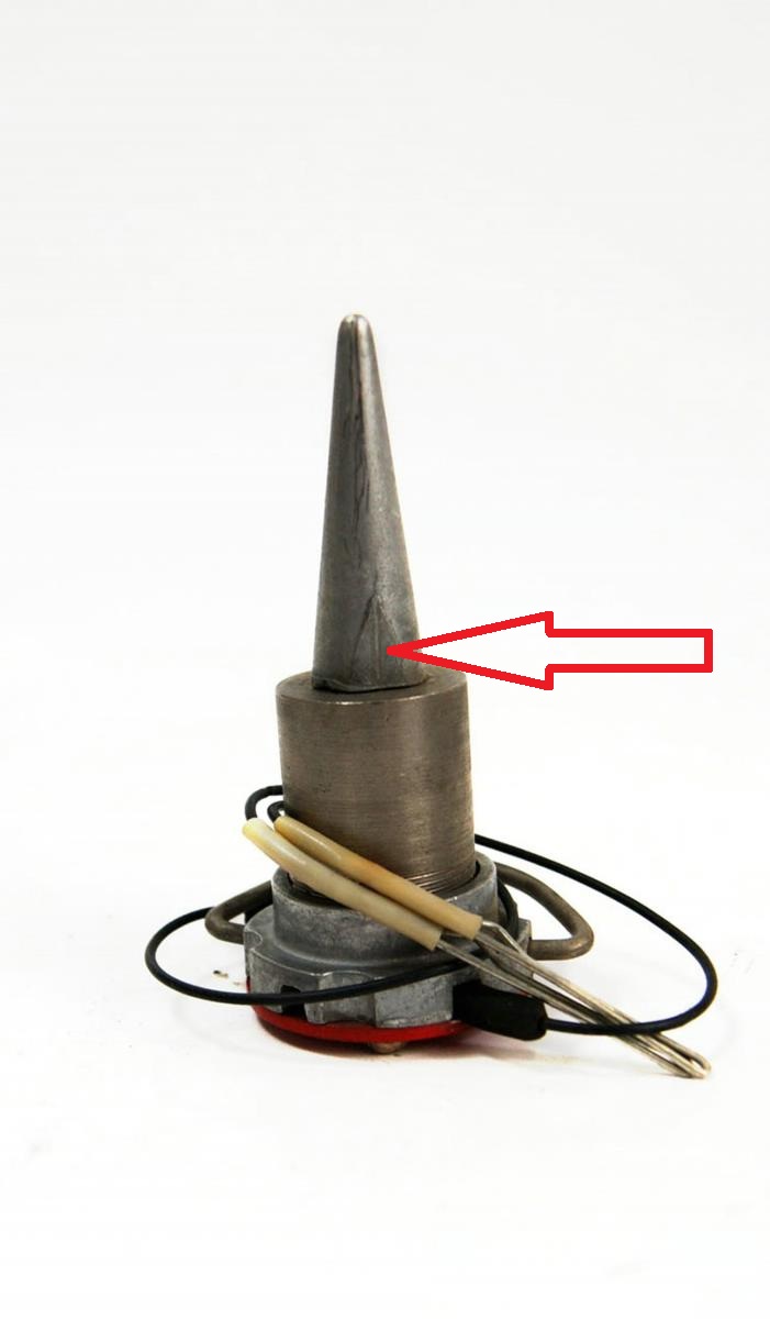 Там вроде по бокам есть спилы как под ключ?Встречал подобное на датчиках то-ли геологов то-ли геодезистов.В детстве моем разматывали по полям с проводами конуса,там оченб похож кончик который в землю втыкали..