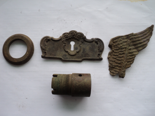 Вот из неопознанных находок прошлого сезона. Фигурная шайба, непонятно от чего. Накладка от замка на ларец. Крыло. И какая-то труба (штуцер) с резьбой и в маленьком отверстии тоже резьба. Может кто опознает что это?
