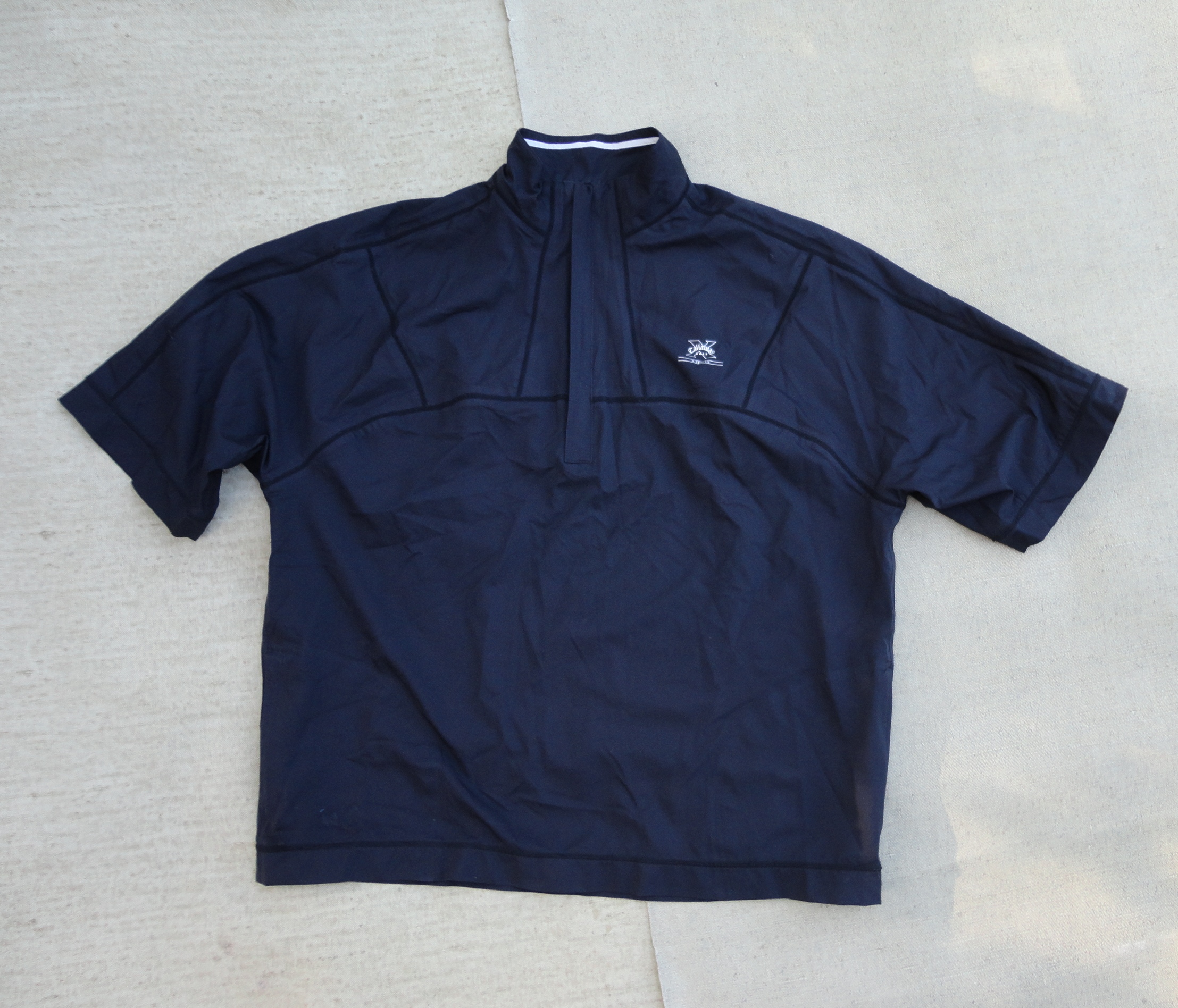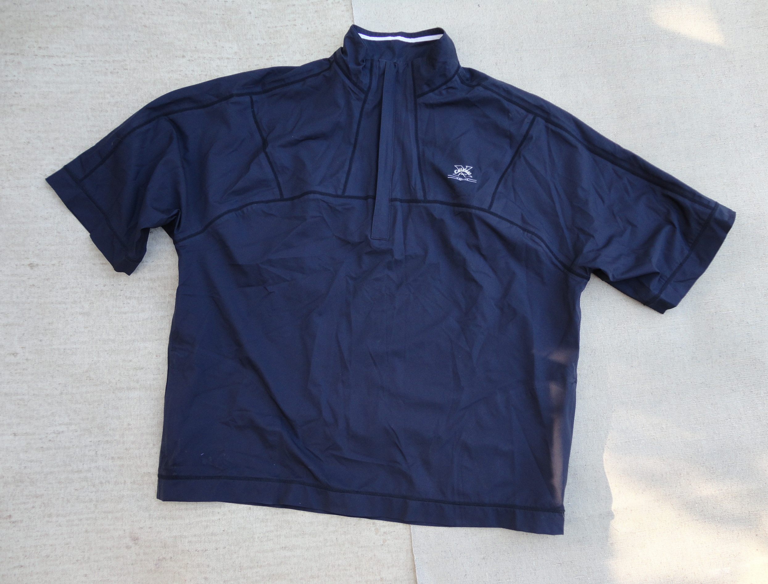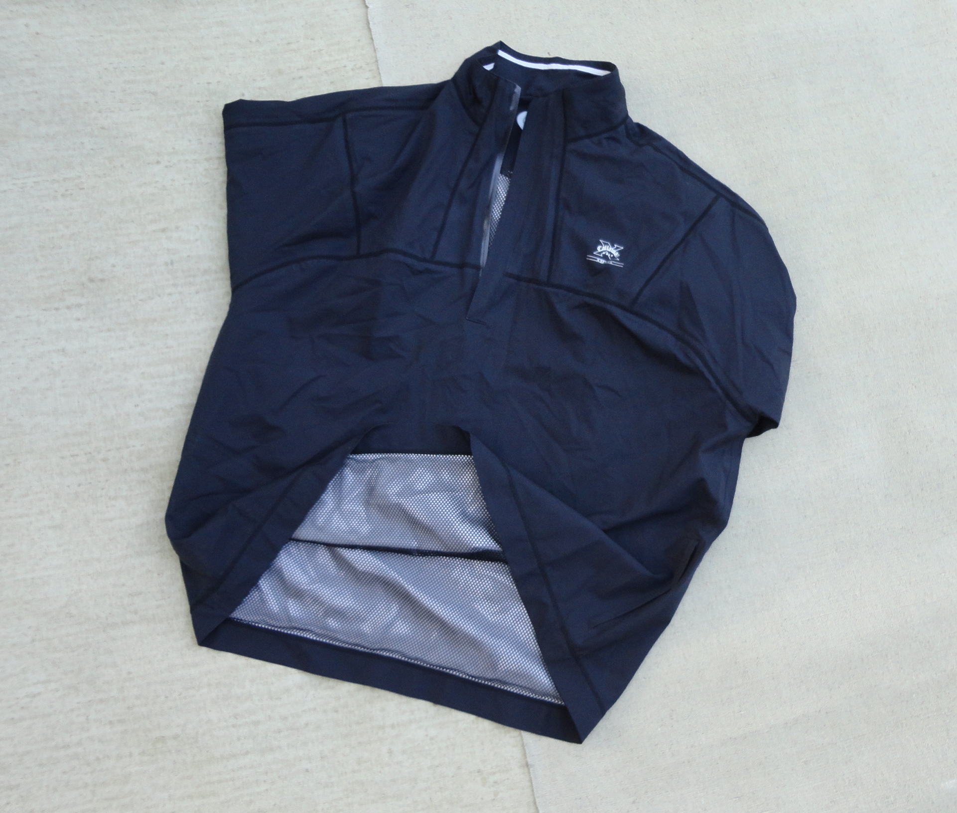 Радикально черный. Очень мягкий и легкий.Практически не займет места в рюкзаке Плащевка,внутри дышащая подкладка.Молния. Состояние отличное. ПОГ - 66см По спине -75 см