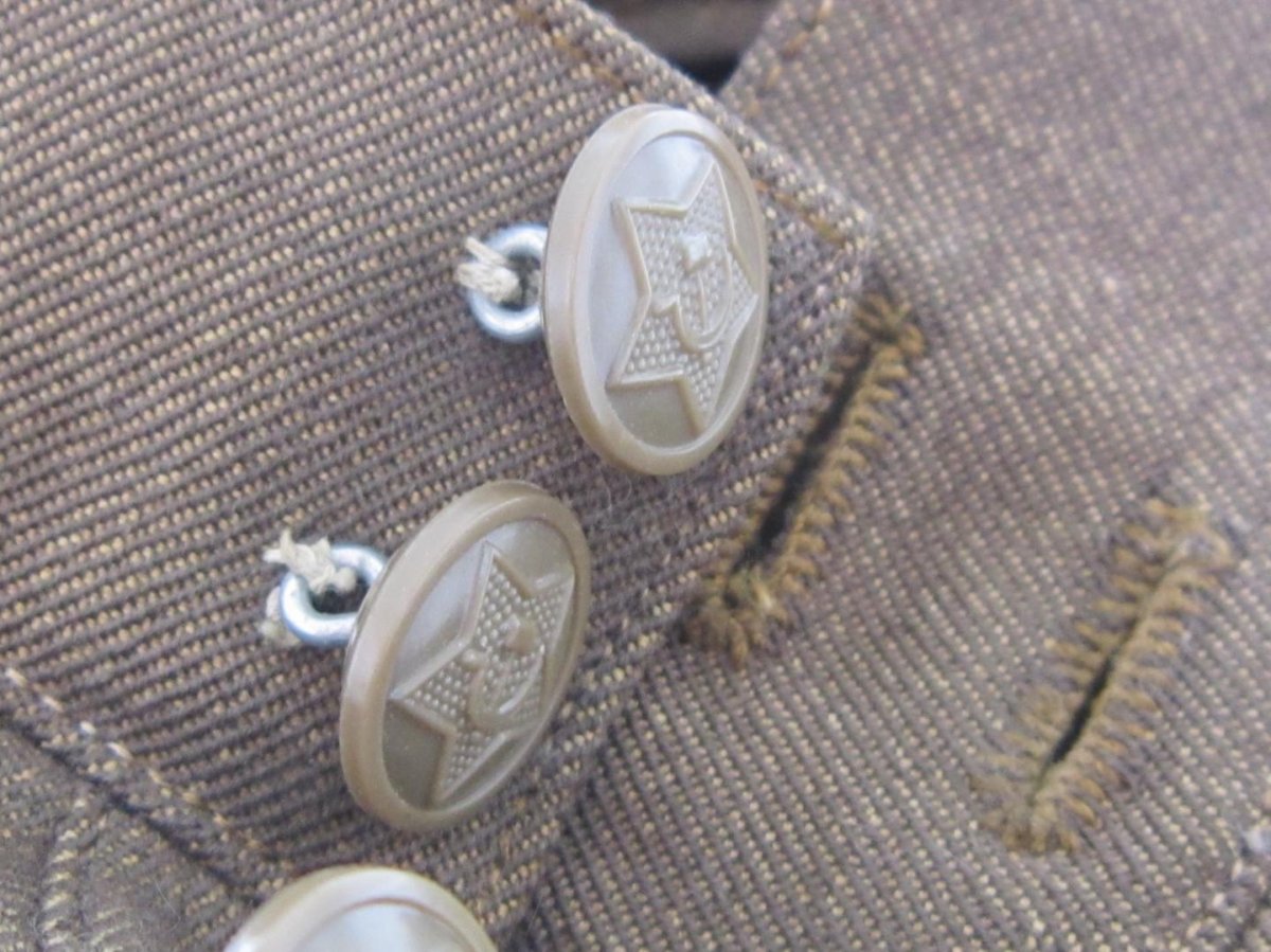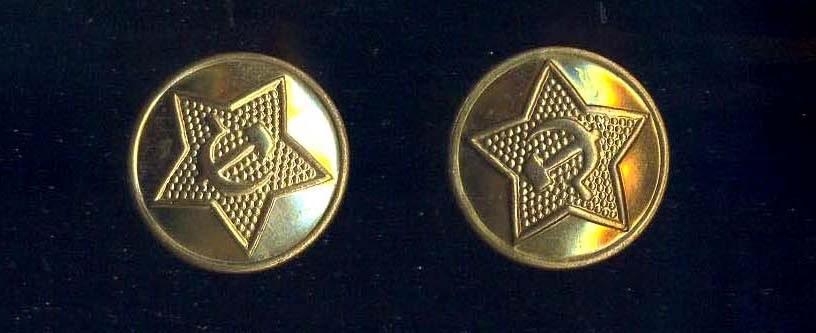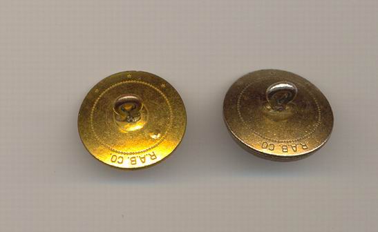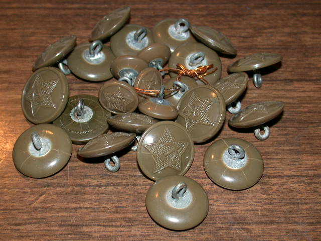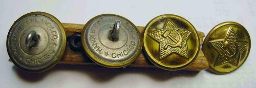 Пластиковые армейские пуговицы со звездой, серпом и молотом американской фирмы R.A.B. CO. (Richard Alan Button Company), которые довольно часто встречались на шинелях, гимнастёрках, петлицах персонажей оригинальных фото. В то же время флотские пуговицы с якорем, той же фирмы R.A.B. CO., на снимках попадаются редко, хотя использовались на флоте, судя по фото, ещё очень долго после 1945 г. Удобный, практичный материал и внешний вид сыграли свою роль. Причем стоит заметить, что данные пуговицы предназначались именно для СССР. Для своего флота в США пуговицы внешне были совершенно другие.