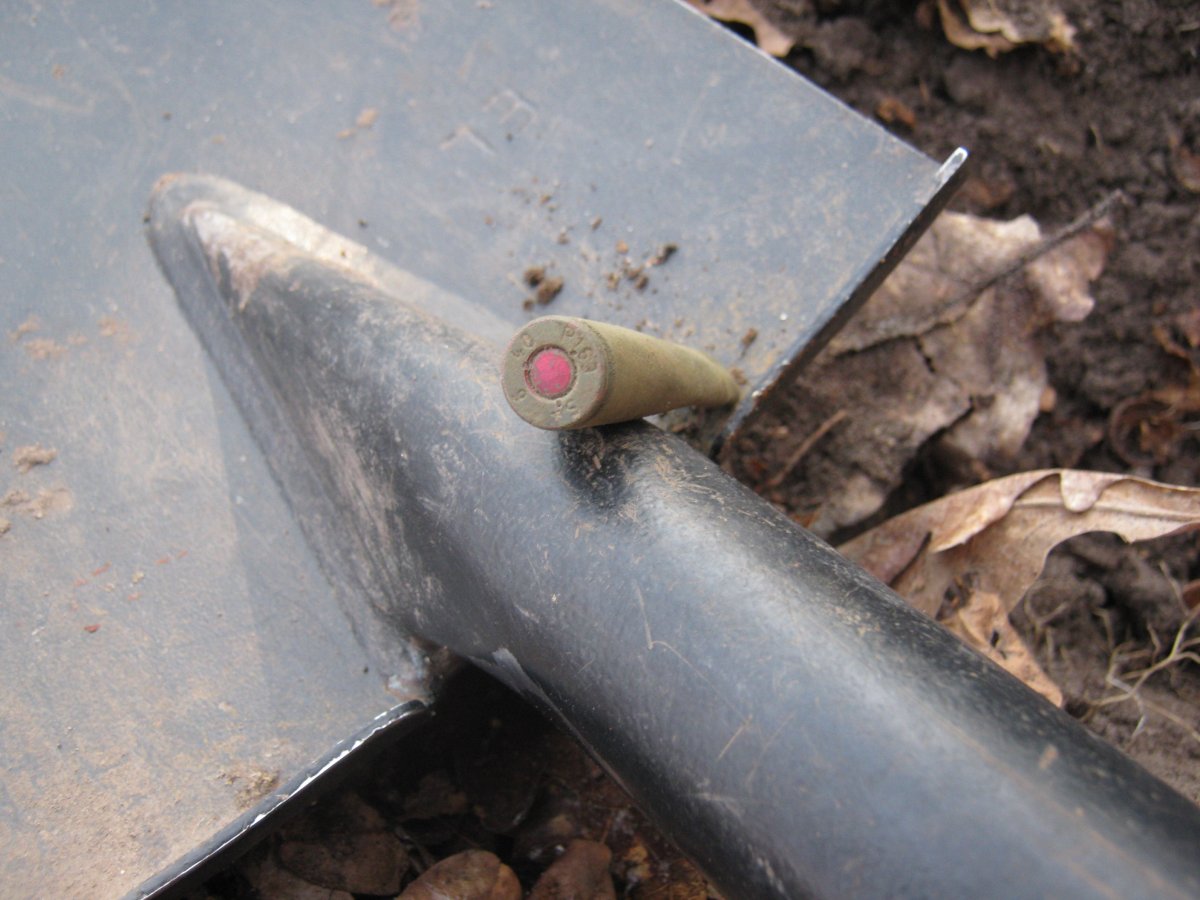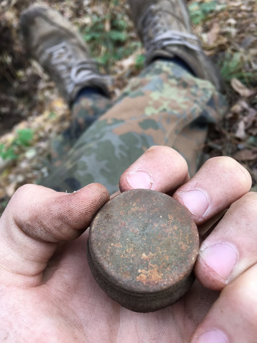 С позволения камрада, дополню тему парой снимков. Сперва, шастая по оврагу, выбрел на сброс с удивившим содержимым - фильтрами от немецких противогазов. Все, как назло, мертвы. Пройдя чуть далее, абсолютно случайно, наткнулся на колышек из прессованного бука. Никогда не находил, порадовал. На позициях стал встречаться бестолковый хламец, среди которого, все таки, удалось выдернуть несколько неплохих крышек от колотух. Ну и под конец, попались взрываки и тротиловые(?) шашки, потерянные нерадивым сапером.