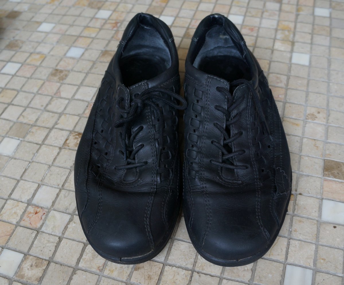 Б/У цена 500 грн. размер 44, дышащие, на лето. Надо подшить по шву сверху. Подошва нигде не отходит. Пару сезонов походят легко. видео тут