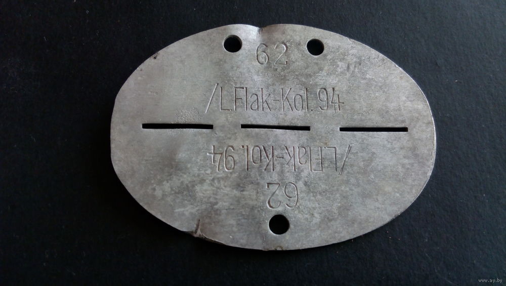 leichte Flak kolonne leichte Flak-Abteilung 94 (mot.) Добрался до компьютера, перевел, то, что так же, читал на форуме-дер-вермахт. Да, все таки колонна снабжения 94 зенитного абтейлунга. Интересный жетон, да еще и с двух сторон набивали. Судя по вашим сообщениям, вы из РБ, там летом 1944 года, много кто, жетоны побрасал, вроде и тыл был, а тут раз и группы армий Центр, почти не стало. А, точно, по ссылке же Вашей: Heavy losses at Bobruisk (6.44), disbanded 8.44. Уничтожен под Бобруйском и расформирован, лето 44.
