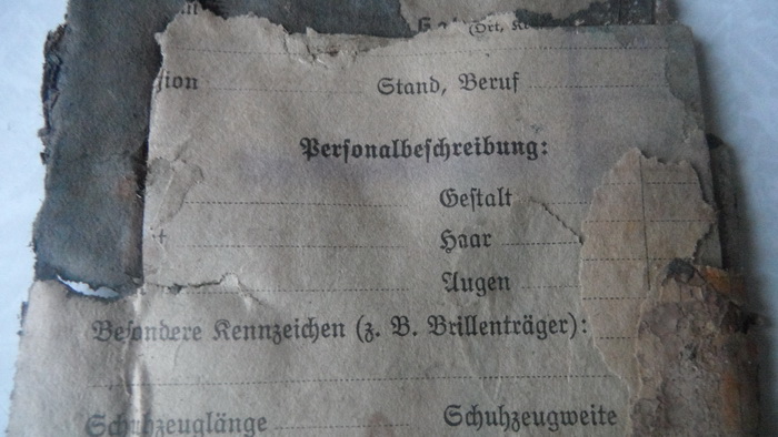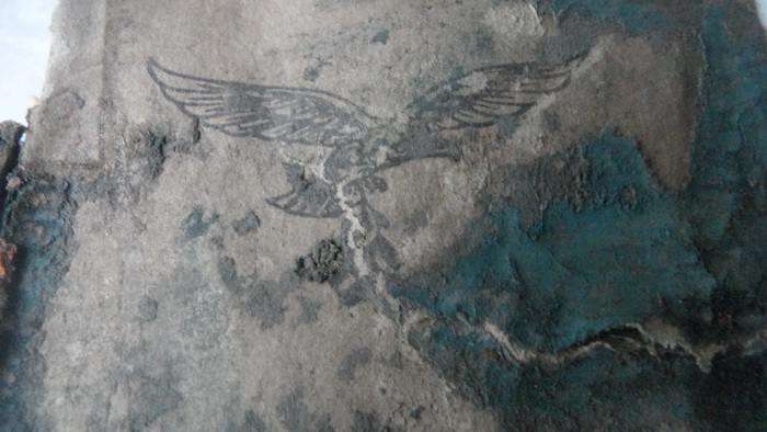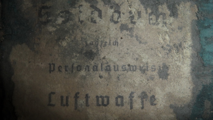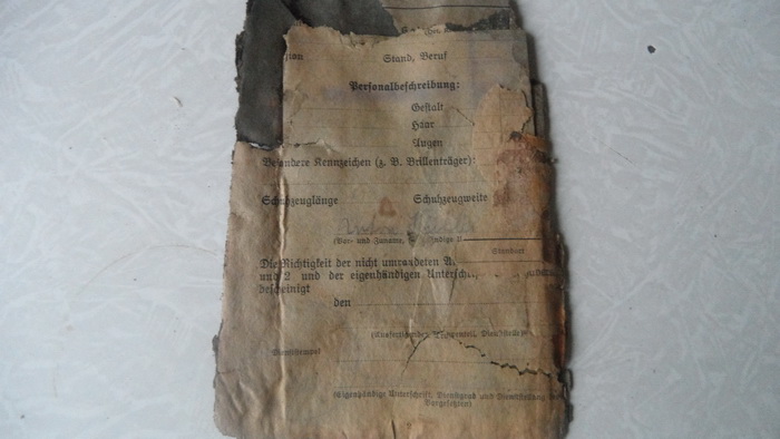 Зольдбух военнослужащего Люфтваффе. Надписи можно проявить, над обратиться к тем кто советских бойцов поднимал, часто бумаги нечитаемые в капсулах, вроде как сканируют и химичят в фотошопе
