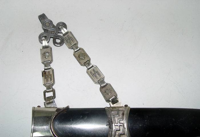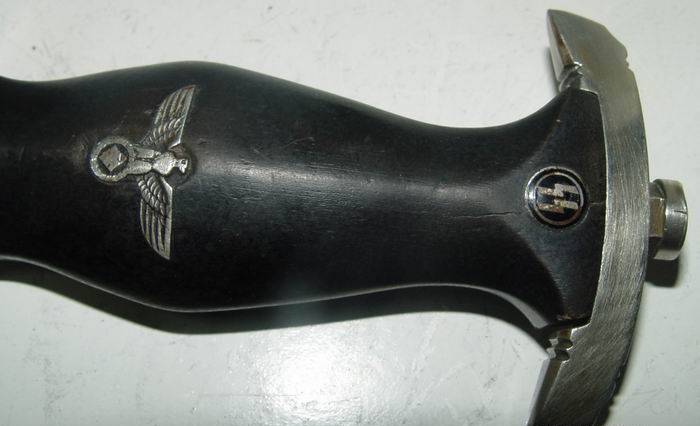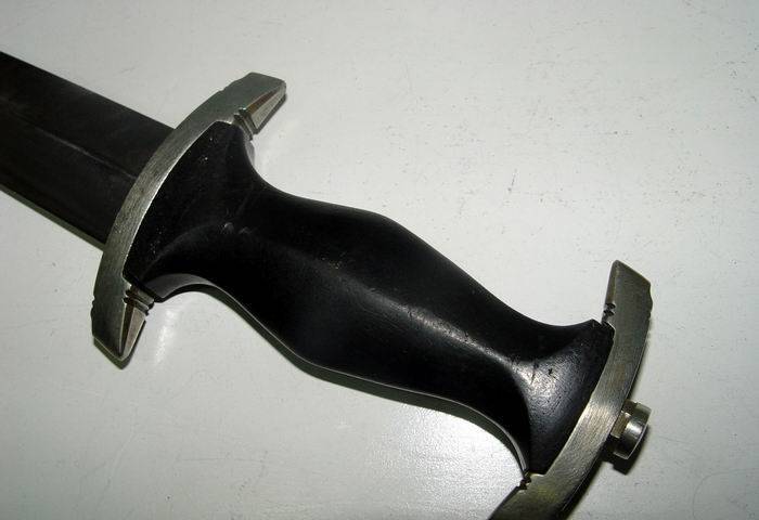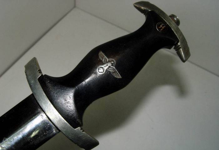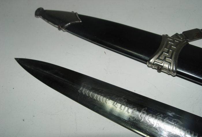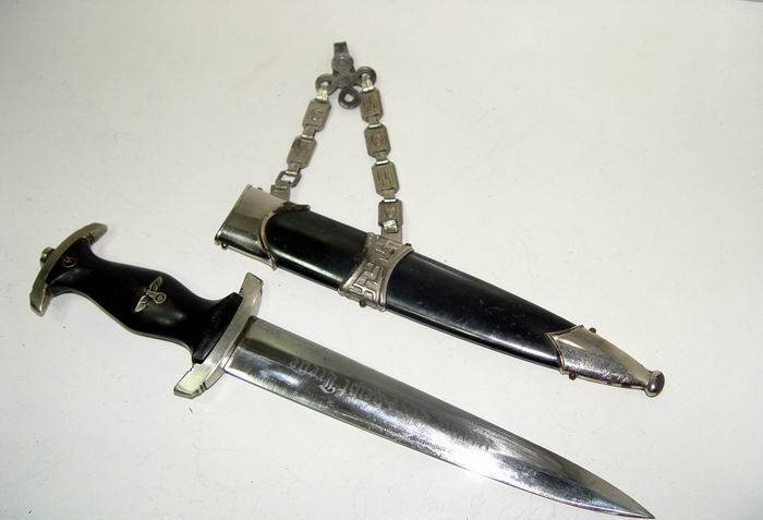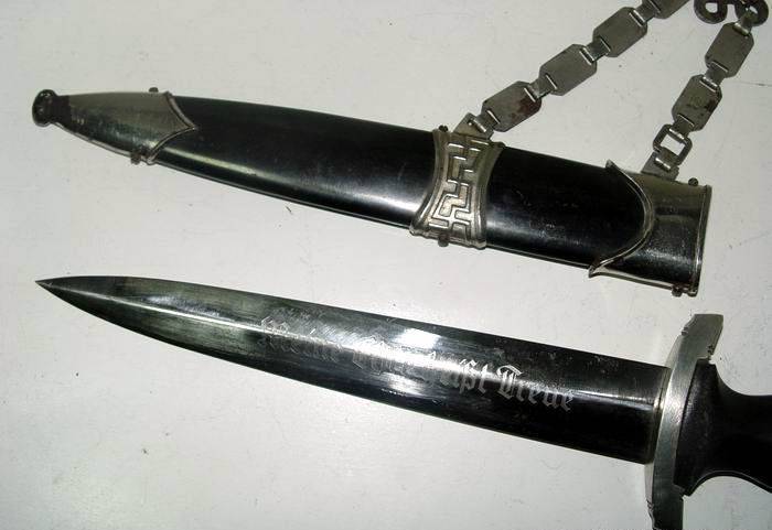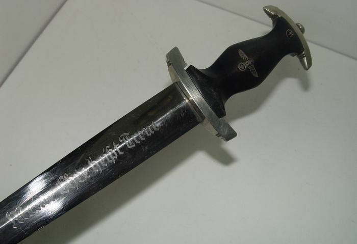 Кинжал СС. "Лидер" образца 1936 года. На клинке полностью сохранилась заводская полировка. На лицевой стороне нанесен травлением девиз СС "Meine Ehre heisst Treue" (Моя честь называется верностью), клеймо отсутствует, что характерно именно для кинжалов данного типа. Свастика на рукоятке несколько затерта, но реставрации и вмешательствам данный предмет не подвергался.