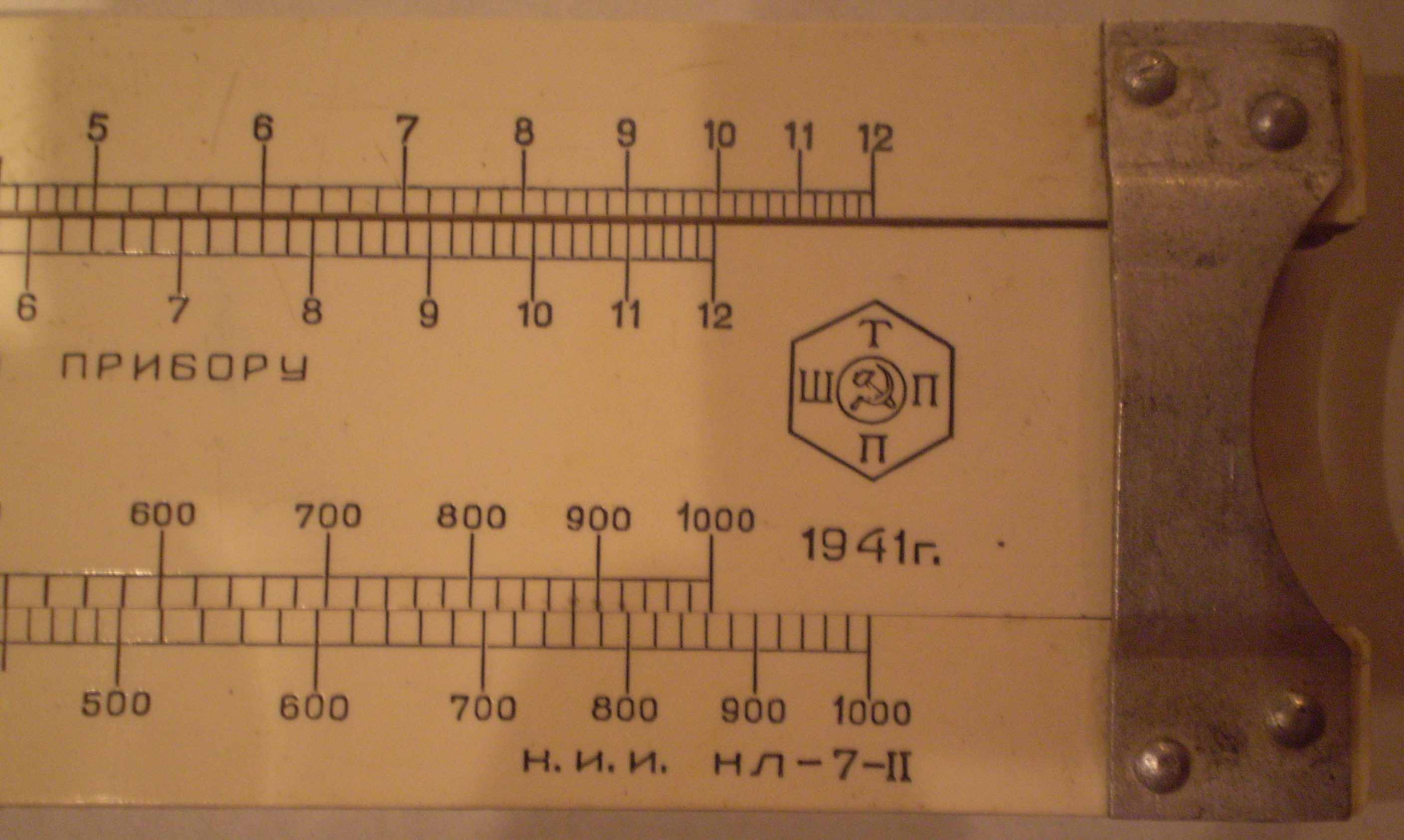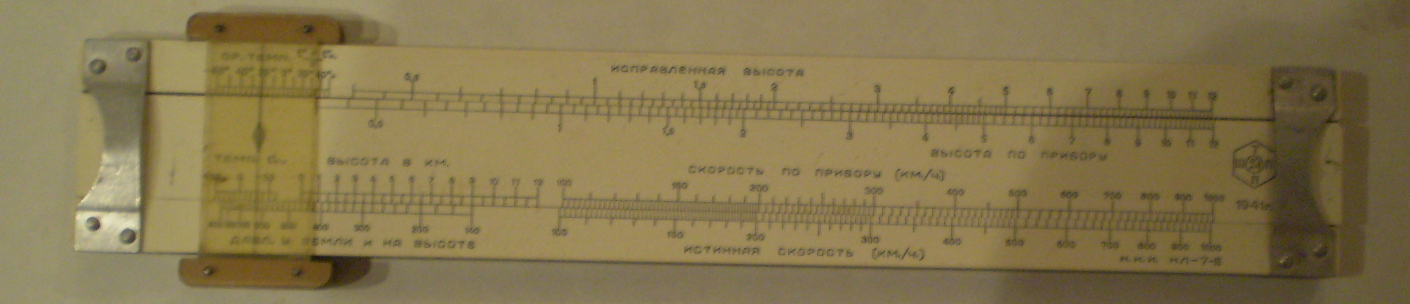 А чего ты паришься с названием ? Там же в уголке (правом-нижнем ) чётко записано НЛ-7-ІІ (навигационная линейка-7-серия 2) . Практически аналог сегодняшней НЛ-10м, только , как я посмотрю, без углов ветра и углов сноса и всякой дополнительной шелухи для внесения поправок применительно к сегодняшним скоростям и высотам и поправок по ним. До сих пор иногда пользую, что б сноровку не потерять ( хоть и эти сраные Жи-Пи-эСы везде понатыкали) народ скоро по карте летать разучится .Почему одна 7 а другая 10 - убей не помню. Думал - по количеству шкал. Проверил - ан нет. Может по количеству решаемых задач, потому что на 7 реально меньше шкал. На счет штампа не скажу, но наверное что-то типа : штурман-тех-снаб-сбыт-супер-пупер-фабрика-прибор. С уваженим...
