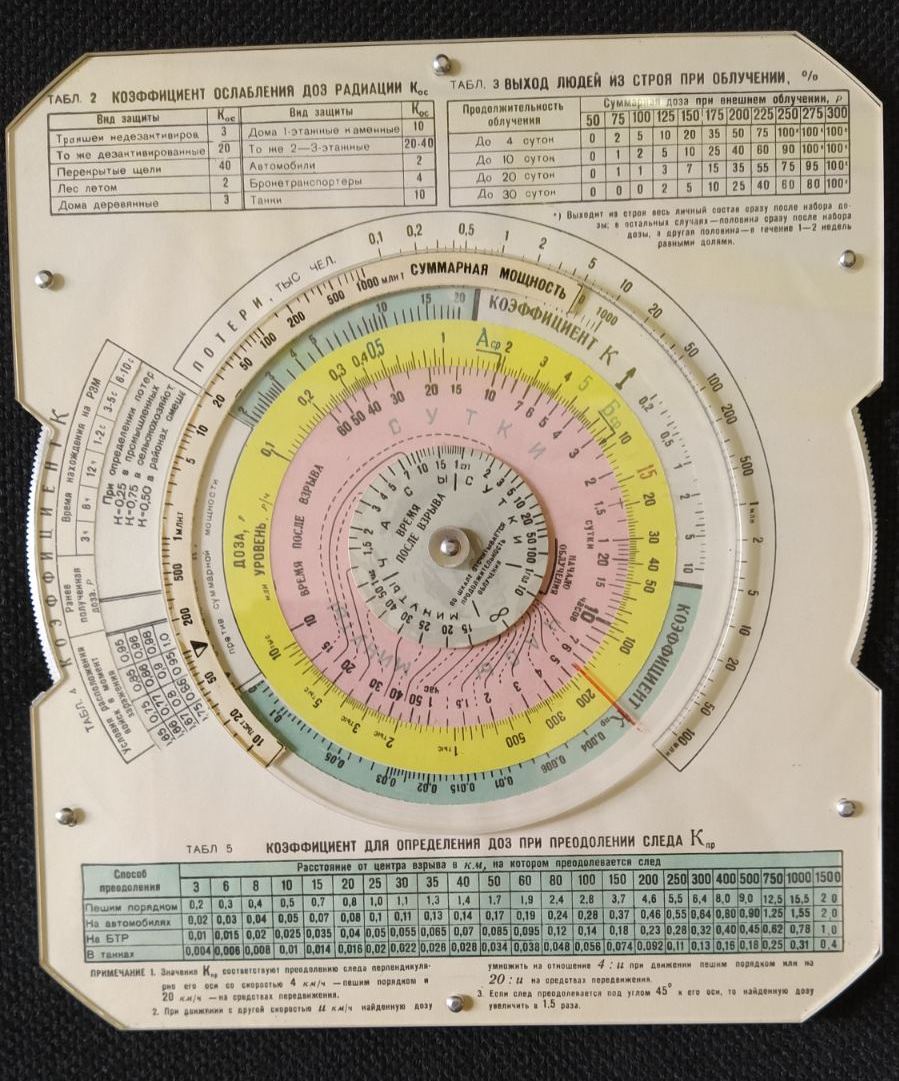 Доброго дня! Прошу оцінити лінійку. Призначена для оцінки (прогнозування) параметрів радіоактивного зараження місцевості при наземних ядерних вибухах, а також для проведення розрахунків з оцінки радіаційної обстановки ... Все крутиться, працює, дефектів які впливають на роботу при проведенні розрахунків - немає. У комплекті, як і належить, йде опис, чехол і правила користування.