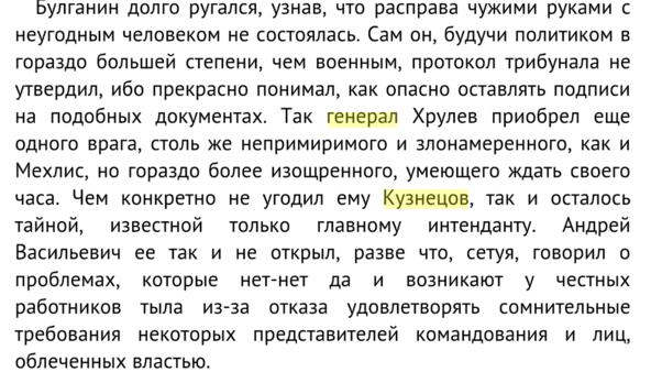 Наша фирма веники не вяжет. Наша фирма лапти плетёт ) Редечкин для Кошевого - всего лишь подчиненный. Я понимаю, если бы они были в приятельских отношениях. А так..., с чего это Маршалу подставлять себя лишний раз. Своя рубашка всегда ближе к телу. Для советских военачальников, особенно тех лет, это была чуть ли не азбучная истина. И к тому же, зная крайне непредсказуемый нрав и сложный характер Хрущева, от которого все можно было ожидать. Сегодня друг, что-то не так сказал - и уже в противоположном окопе. У него особо в приятелях долго не задерживались. Да и из военных не так уж и много их было. Еременко видимо самый закадычный, ну можно еще условно назвать таковым Малиновского.