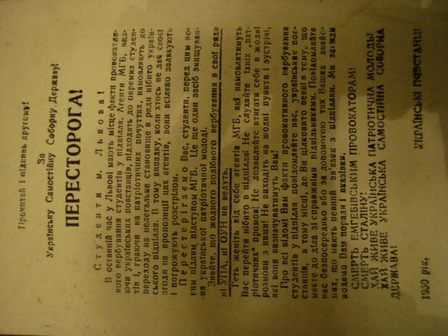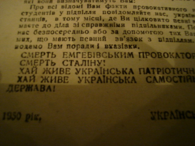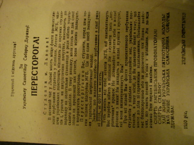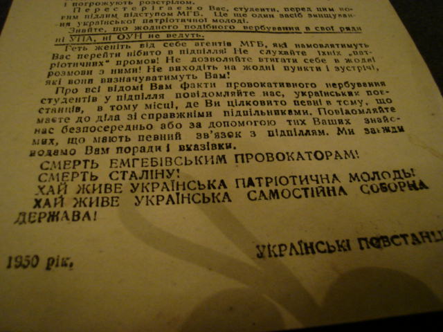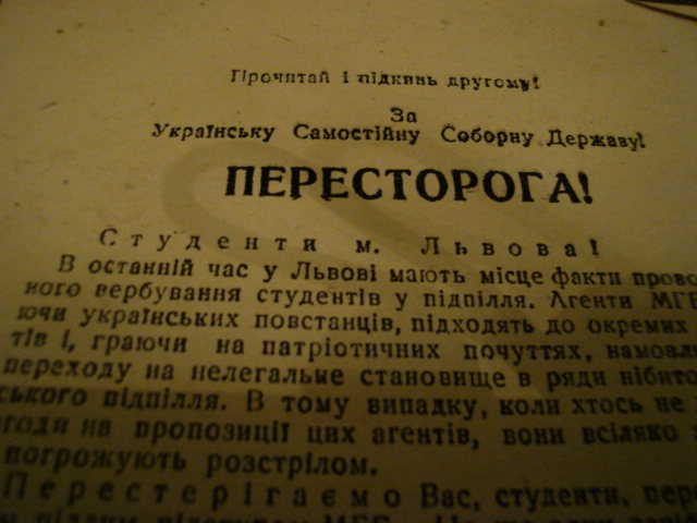 Ответ: Листовки УПА Настораживает "1950 рік" Во первых, какого черта год на листовке печатать? Если бы это был приказ, то дата там уместна а так.... К тому же к 50 году кажется уже не было подпольных типографий под Львовом
