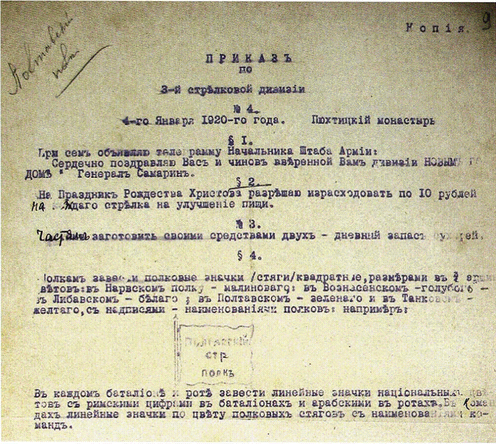 1. Рядовой отряда светлейшего князя Ливена, 1919 г. 2. Рядовой пулеметной команды 5-й (Ливенской) дивизии, 1919г. 3. Поручик 5-й (Ливенской) дивизии, 1919 г.