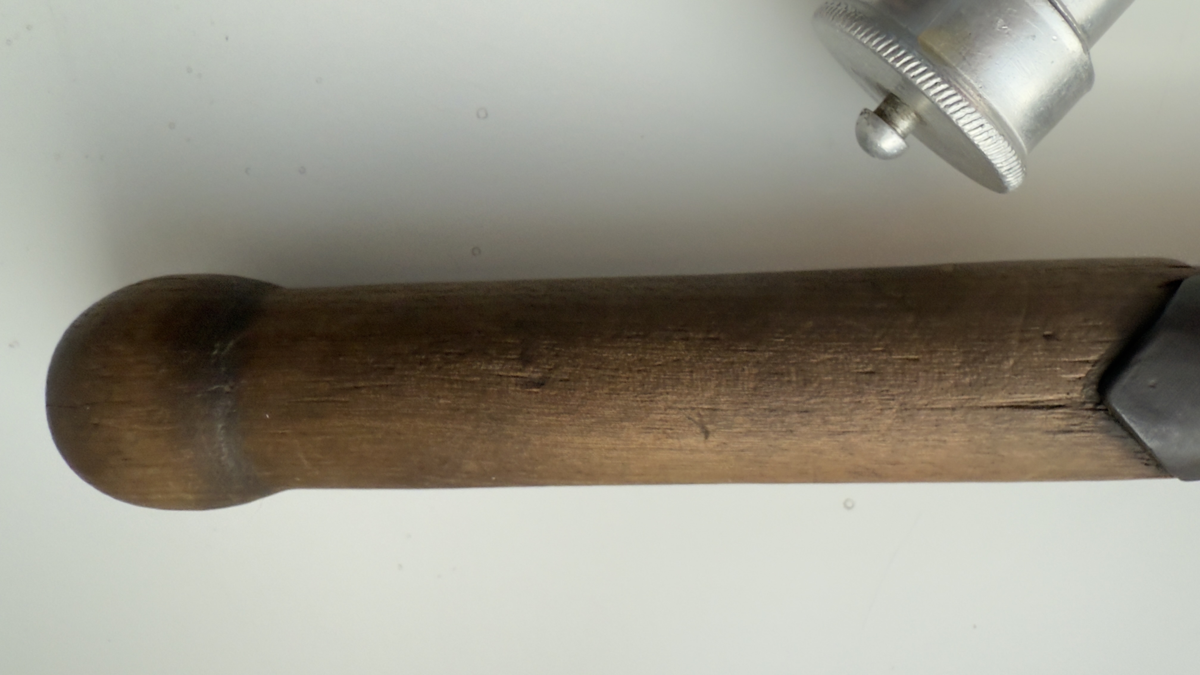 Вот в этом месте не выполнена подгонка лепестков лотка с деревом черена, железо просто наложено сверху. В оригинале делалась "анатомическая" выборка в дереве черена и эти части подгонялись заподлицо с деревом. На многих экземплярах подобных лопат, от разбухвания дерево даже начинает выпирать поверх металла.
