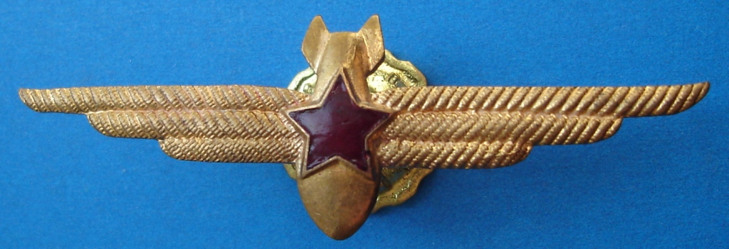 Знак летчика представлял собой развернутые крылья, состоящие из трех перьев. Верхнее перо имеет насечку со встречным уклоном от края и от центра знака к середине пера. У нижних перьев наклон насечки только от края к центру пера. Посередине знака размещены два скрещенных меча, и на них наложена красная пятиконечная звезда с лучевой насечкой под эмалью. Все детали знака золотистые. Изготовлен из латуни. Размер знака 23x99 мм......" http://izhig.ru/znaki-i-zhetony/nagrudnyye-znaki-flotskim-spetsialistam-letnogo-sostava-aviatsii.php