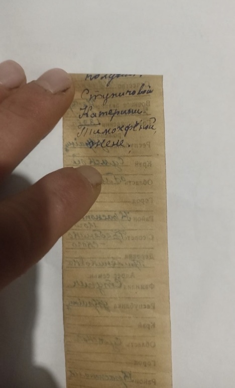 Вот боец на памяти народа. Списан 27.09.1943 по ранению. https://m.pamyat-naroda.ru/heroes/isp-chelovek_spisok4971405?last_name=Ступин+&first_name=Иван+&middle_name=Иванович+&birth_date={"date_start":"1897-12-31T21:57:56.000Z"}&page=1 Упоминается в нескольких документах, причём в одном название родной деревни пишется Гребенековка, в другом — Гребениковка, в третьем — Гребеновка. И документы, замечу, составляли писари, а не полуграмотные бойцы. У самого Ивана Ивановича, как я и предположил выше, действительно 3 класса образования. Но это ладно, это вменяемому человеку было ясно с первого взгляда…. Меня больше интересует, почему модераторы прислушались к бредовым разглагольствованиям про недопустимость грамматических ошибок и тему перевели в раздел «Современные копии и подделки». Тут, я смотрю, мода признавать фуфлом честные вещи? Пинкертоновщина и краснобайство на тему «могло, не могло» — как метод экспертизы?