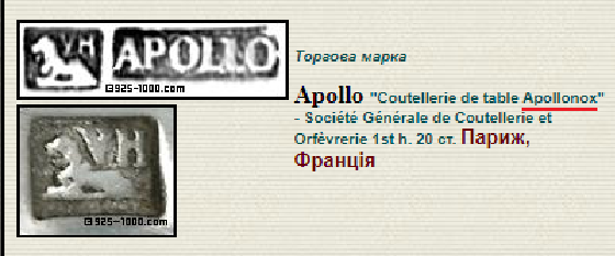 вітаю. датувати клеймо точно важко - безліч сайтів надають невірну інформацію стосовно початку виробництва предметів з нержавіючої сталі "apollonox". наприклад http://gallerymakassar.blogspot.com/2017/01/apollo-orfevrerie.html тобто 40 - і роки. але в каталозі за 1932 рік (самий ранній знайдений в неті) вже вказані предмети з нержавіючої сталі чи до 1932 року фірма робила щось з Н/Ж ? хз.) і на жаль в ньому немає зразка клейма. зразок клейма є в каталозі за 1939 рік але невідомо - букви на клеймі вдавлені чи випуклі. спеціалізовані сайти на цю тему або не вказують дати , або "вилка" становить півстоліття на мою ж думку ваша ложка це перша половина 30 х. імхо.