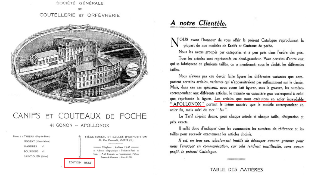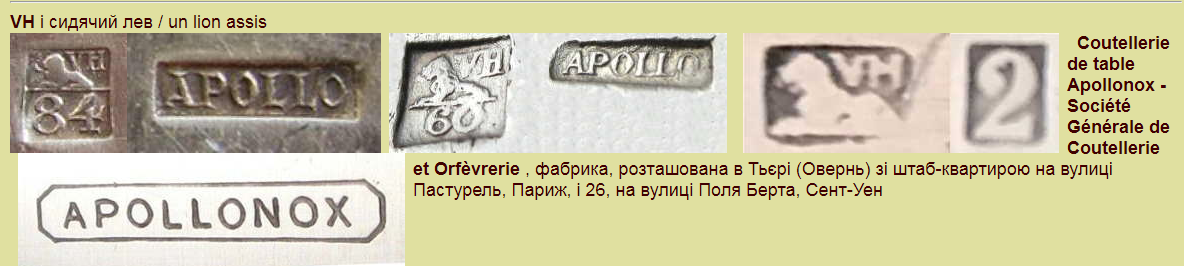 Доброго здоров'я! Виробник зі Франції, Société Générale de Coutellerie & d'Orfèvrerie, APOLLO. S.G.C.O. виробник з історією. Відомий своїми ножами, бритвами, лезами та іншим різальним інструментом. Також посудом та столовими приладами. Але ж тільки у 40-х роках вони почали використовувати нержавіючу сталь для виробництва столових приладів, розробивши побічний бренд Apollonox. На жаль не маю інформаціі, на скільки можливо було виробництво столових приладів у період війни.. Цікавий сайт по французським ножам та столовим приладам https://www.lecouteau.info/catalogues/sgco-1950/