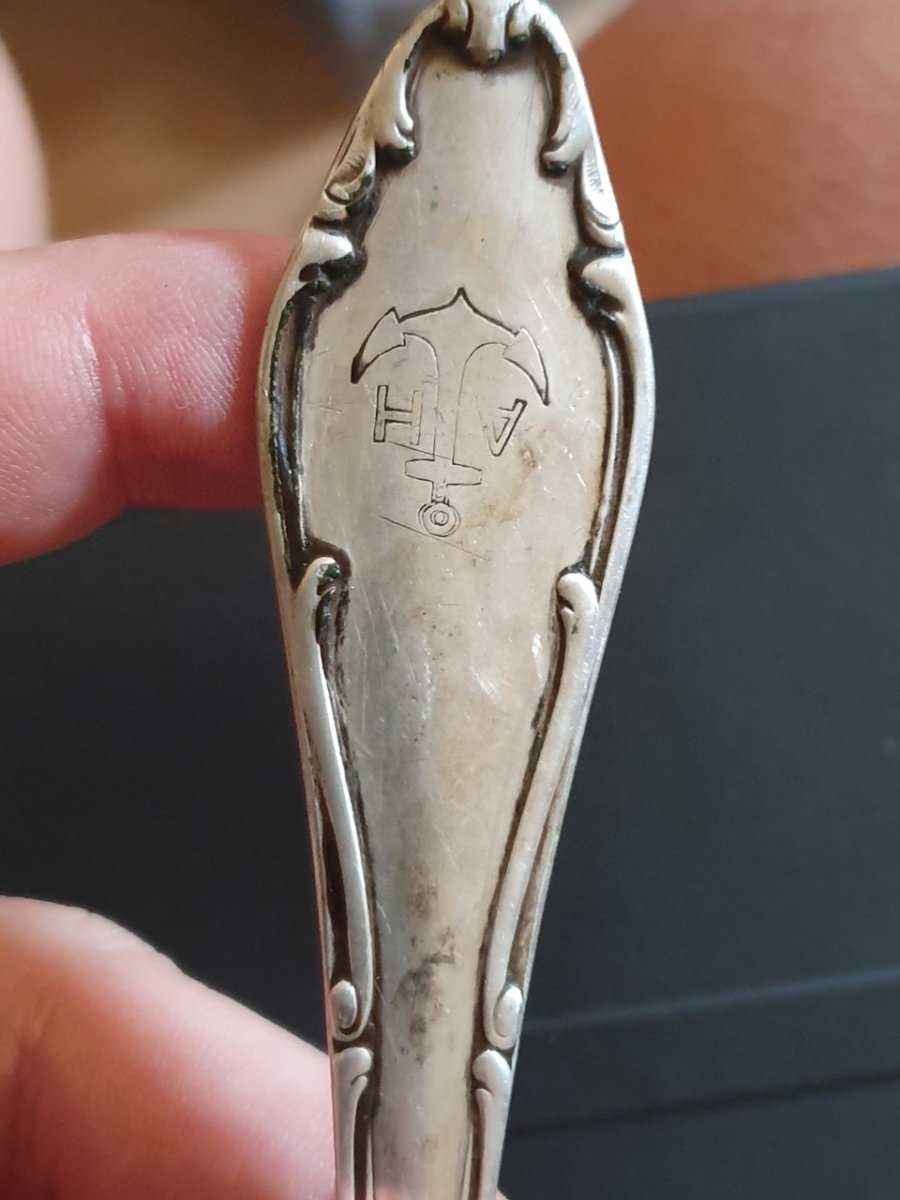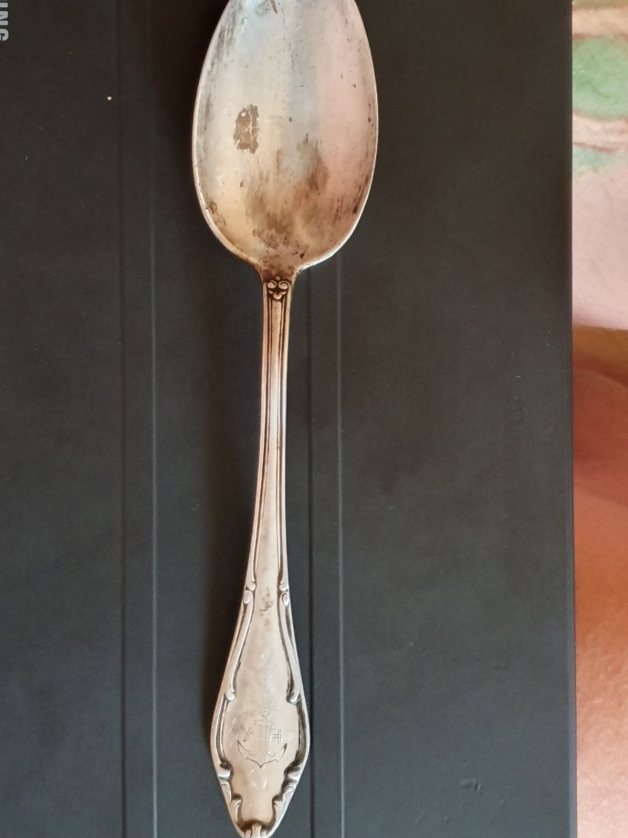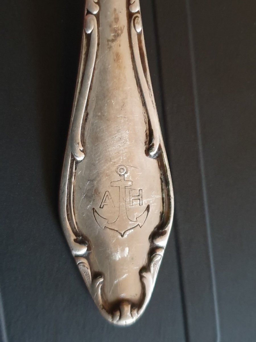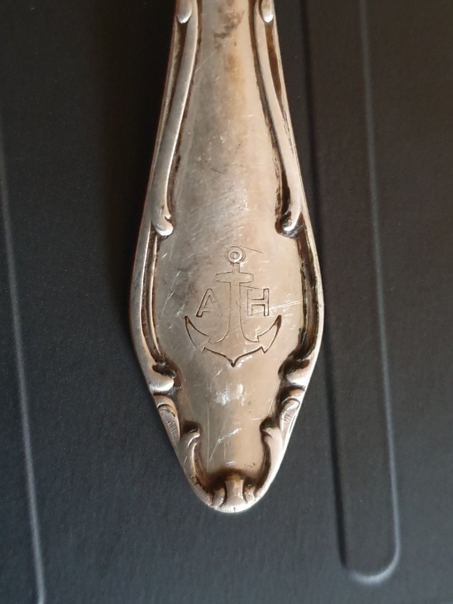 Доброго!ИМХО (на истину не претендую),ложка не из корабельного набора, а, скорее, из т.н. Anchor House (отсюда буквы АН). Первоначально это были гостинные дома-приюты для моряков, оказавшихся "на мели" вдали от дома. Сейчас под названием A.H. существуют также приюты для одиноких матерей,жертв домашнего насилия и т.п. С уважением,