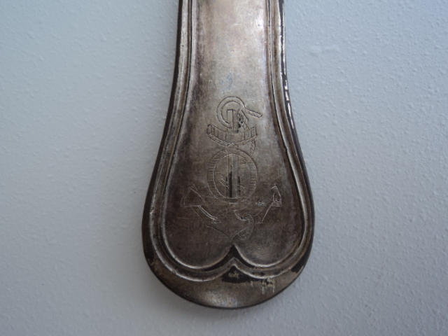 Н-да, чё т я и не ожидал такой реакции на замечание своё. Ажно гранаты в ход пошли. Ну вот ложка с подобным "противопадательным" устройством, продаётся тут: http://www.exonumia.com/Sale10/all01.htm лот 116, обозначена как ложка с тюремного судна 'Success', ажно XVIII века. Данная ложка, видимо, моложе, но, на мой взгляд, якорь + приделанная фигня снизу = ложка с корабля.