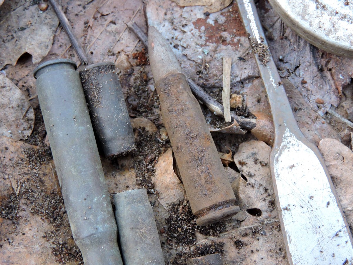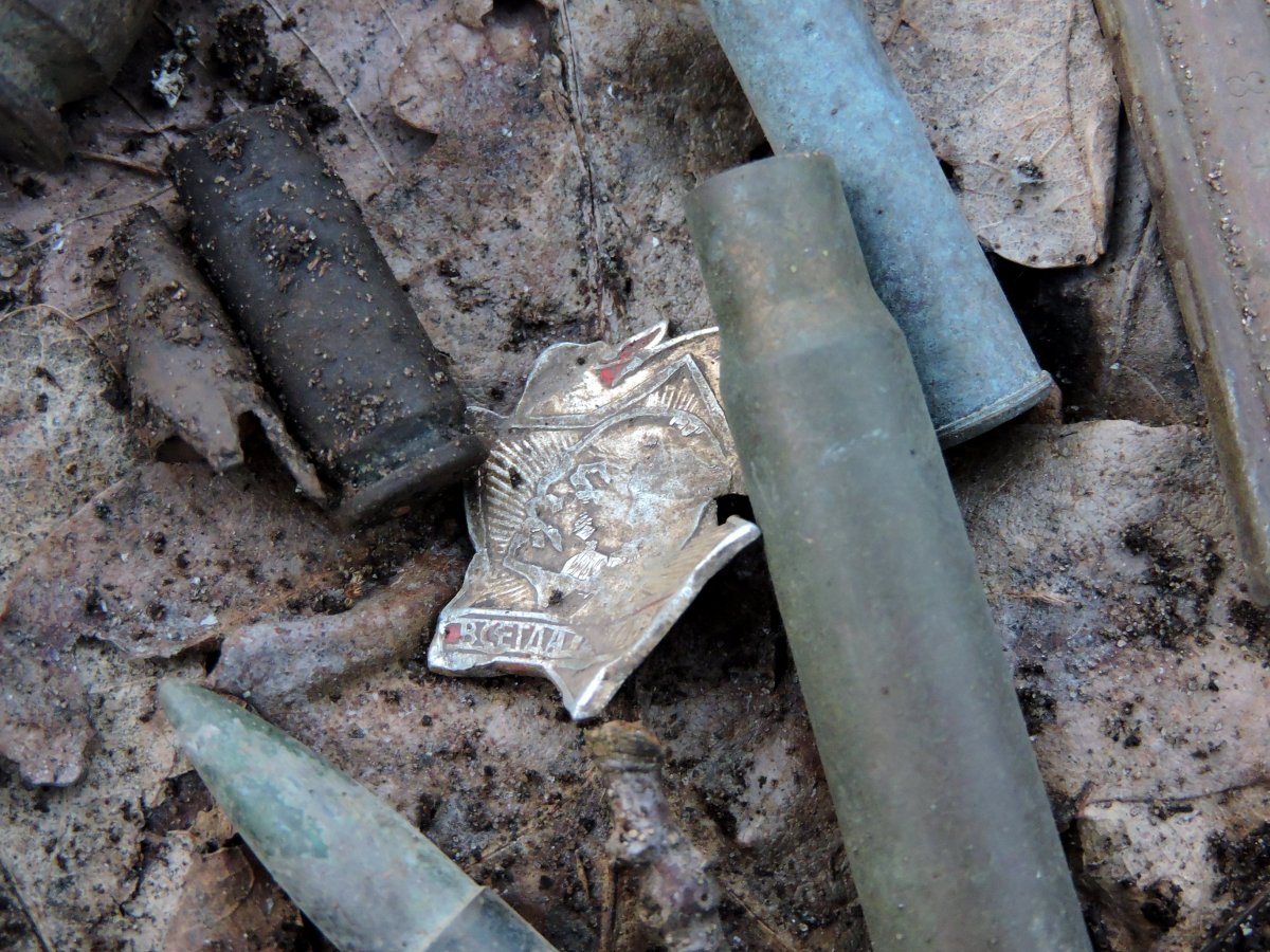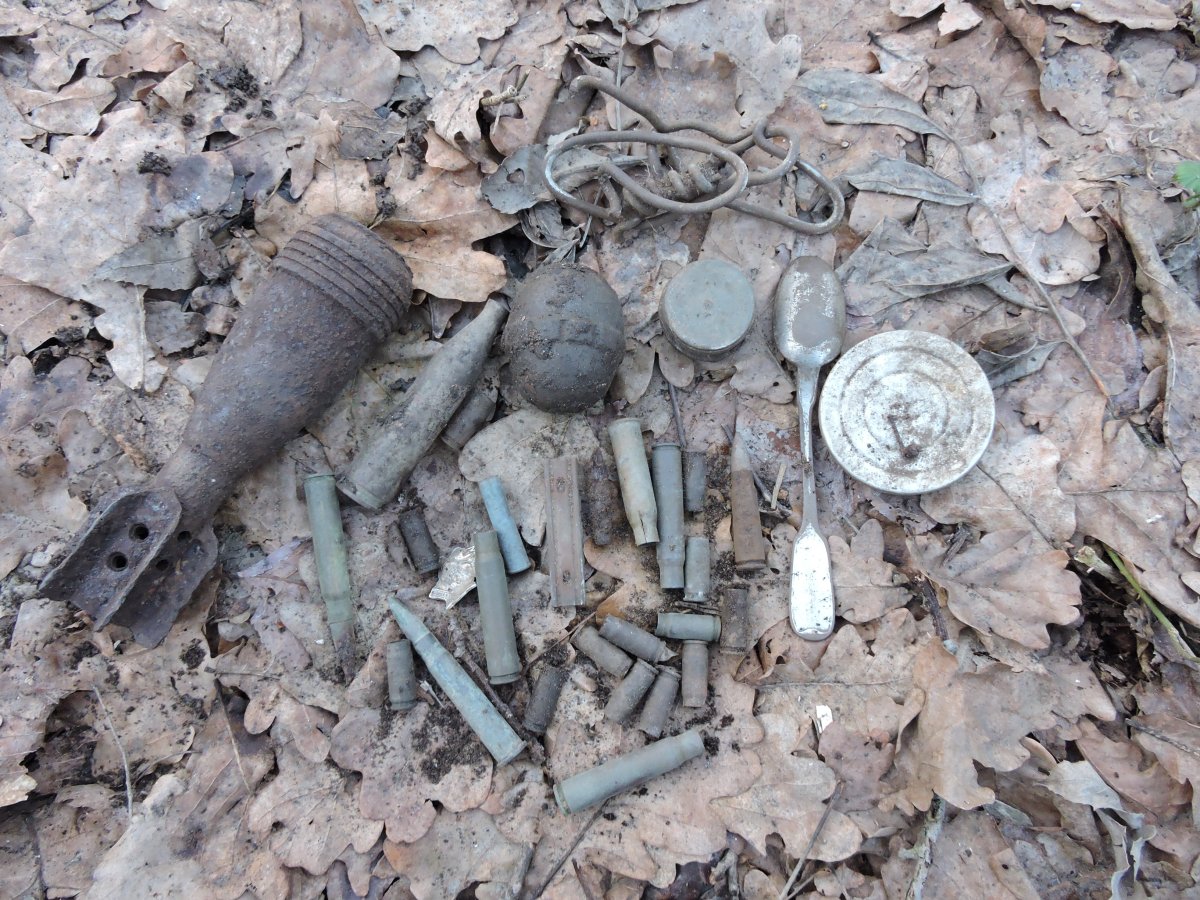 чуть дальше от той высоты в лиственном лесу комрад нашел. и там были свежие ямки, немного но глубокие и маленькие. Мой прибор с такой глубины не берет там по листве немного походили скраю и пошли назад, осколки и немного ппш. У комрада с мд проблемы, провод видимо переломался возле штекера что на пульт идет и замыкает его, а еще перестал отключать железа и повысилось чувствительность. По этому он ходил копал все что звенит и в основном это были гвозди и очень мелкие осколки. Для него это был день гвозде.