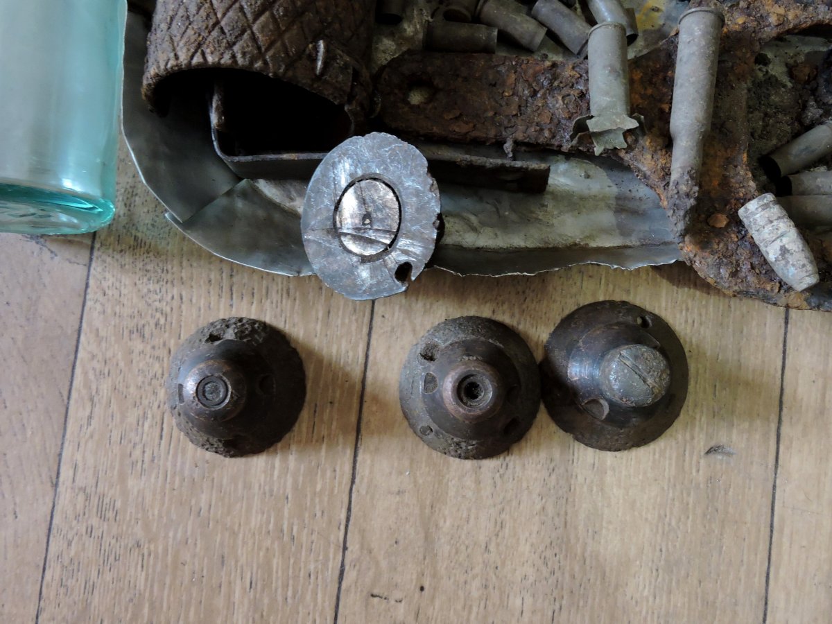 вот эти взрываки лежали возле относительно свежей ямки на брошенной лесничке. их болгаркой срезали от снаряда, не знаю зачем. и потом видимо выкинули или просто припрятали а забрать не получилось. я еще не встречал снарядов с такими взрываками, но в нете частенько видел на продаже эти штуковины вот в таком состоянии (тоже срезанные)