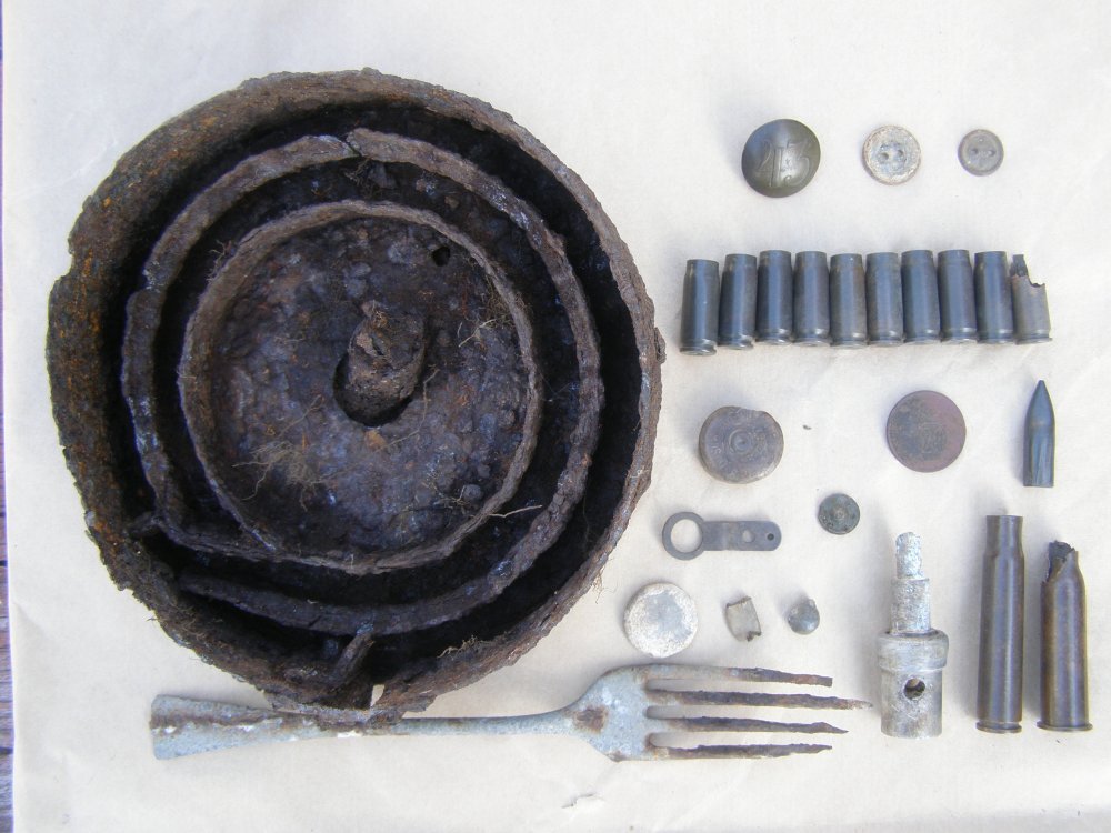 Набрел на окопы-по всем признакам там никто еще не копал.Проверил глубинником-все звенит.Раскатали губы и копали целый день.Итог- 2 гранаты,остатки винтовки,диск ПД, 2 рельсы по 2 метра,уголки для колючей проволоки,переноска Максима и пустые цинки. Короче облом. ВОПы прикопали. На следующий день прозвонили немецкие позиции напротив-кроме настрелов ничего. Кто подскажет что за шип-кнопка? Для чего предназначался? Шип от колеса трактора или противоконная мина????