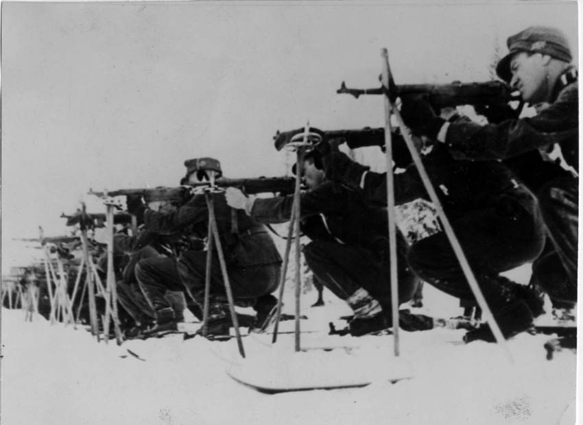 Образцы лыжных креплений из музея лыж в Вадуце. Использование лыж в качестве волокуш. У егеря сзади за спиной Гевер 33/40. Использование саней для транспортировки катушек связи. Лыжные ботинки на итальянском фронте. Спуск "плугом". Крепления "Кандагар". Лыжи с металлической окантовкой. Стрельба на лыжах из пистолет-пулемета. Хорошая фотография, на лыжах справа - классические "Кандагар", слева - нестандартные с застежкой-затяжкой на пятке. Лыжи в Заполярье. Марш на лыжах. Видно ремни кожаных креплений.