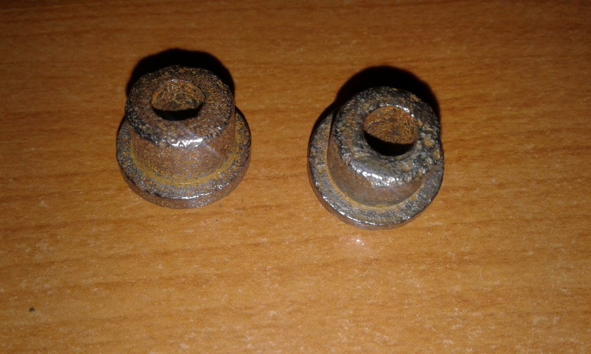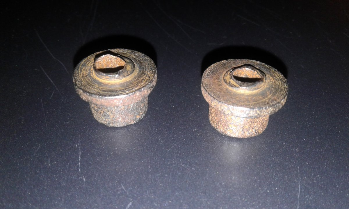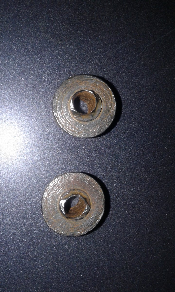 Відпиляв ріжки зі шолома, бо шайби повністю згнили. Старався спилювати залишки шайб, але вони зарази ніби приварились до розклепаних трубок ріжок, тому так вийшло. Думаю наварити, обточити в розмір і поставити їх, так як стан їх самих непоганий. На фото стан в середині видно.