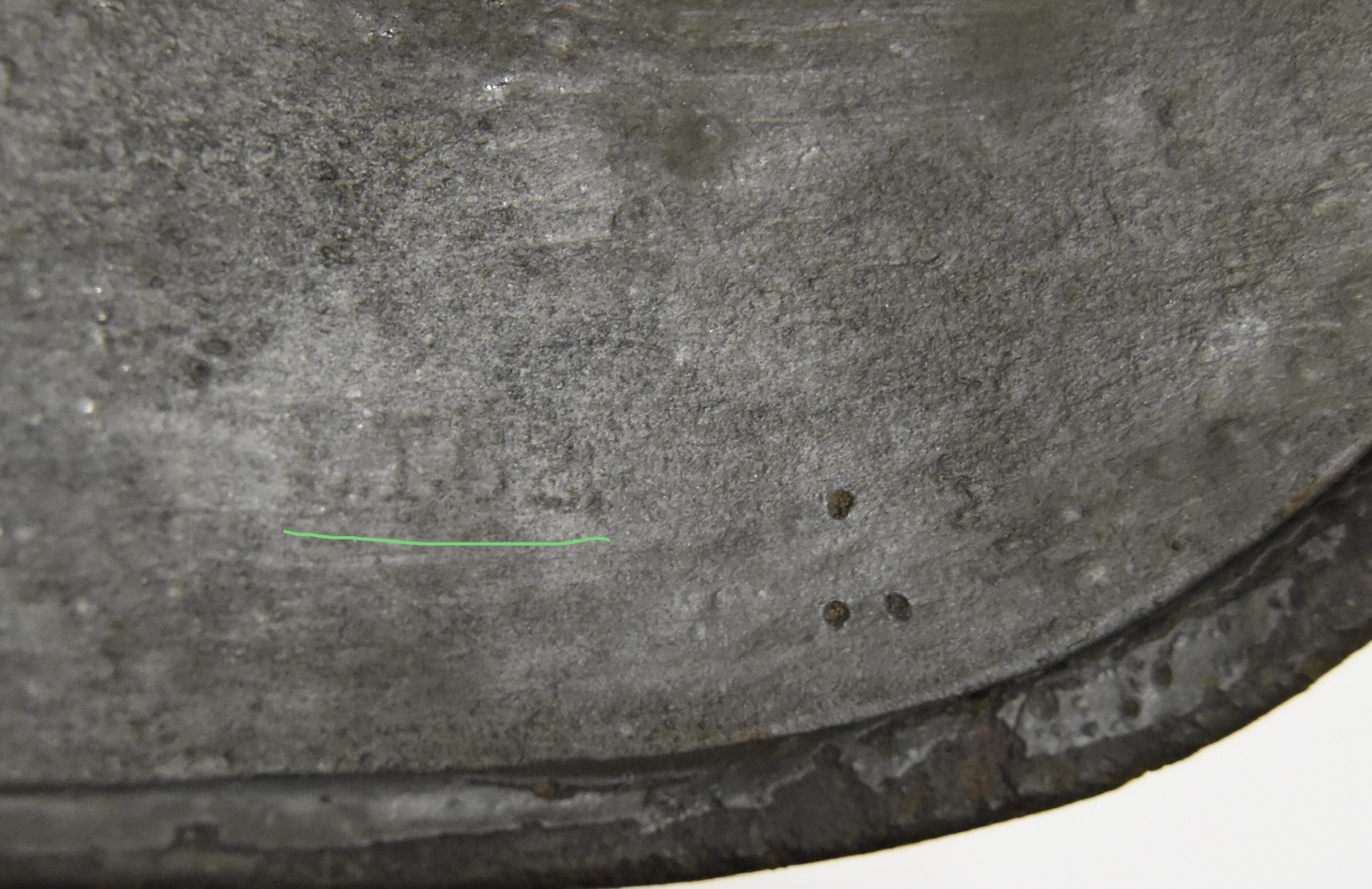 Приветствую . На предпродажную оценку такая м-35 дд вся в нескольких слоях родной краски Четко видны клейма производителя-размера ЕТ62 и партии 3194 Сзади подпись владельца звание и фамилия Gefr.Dolch Каска крепкая ( есть трещина , кому нужно можно свести плотно в зазор и капнуть сваркой, я делать этого не стал).